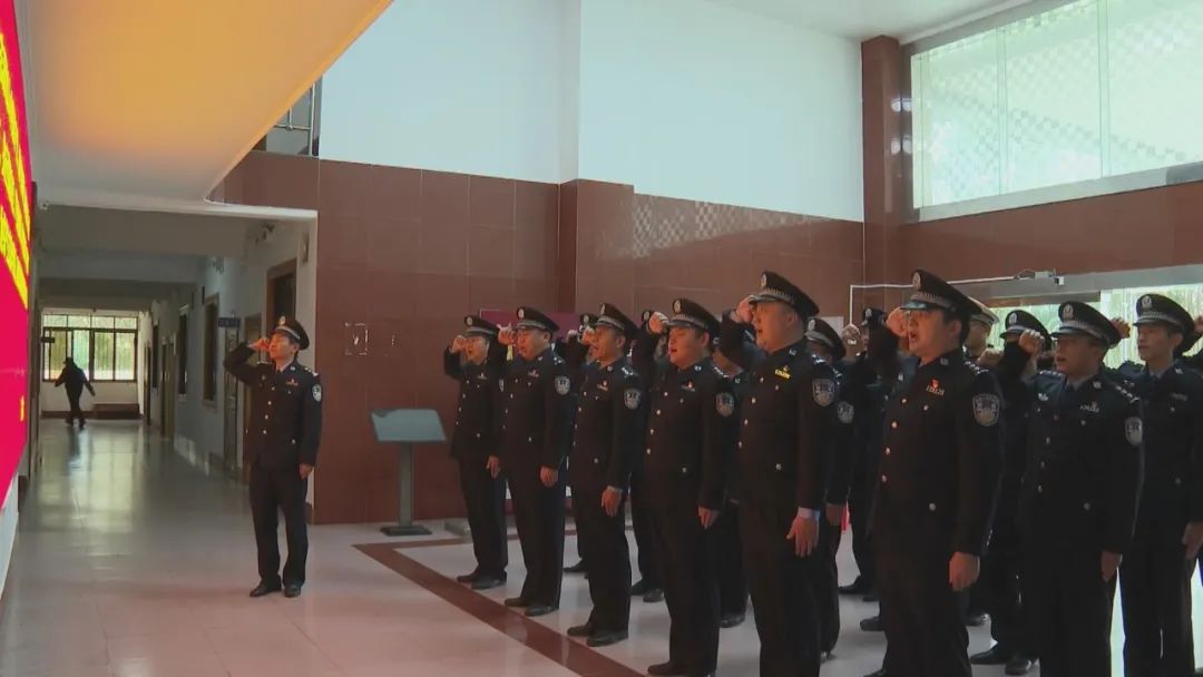 上午8点30分,参加升警旗仪式的全体民警警容肃整、列队整齐。随着《中国人民警察警歌》前奏响起,警旗护卫队员英姿飒爽、气宇轩昂地走上升旗台。中国人民警察警旗伴着豪迈的音乐旋律冉冉升起,全体民警面向警旗庄严敬礼。升旗仪式结束后,全体民警来到县局大堂,依次重温入党誓词、中国人民警察入警誓词,全体民警用一声声铿锵有力的誓言,表达对公安事业的无限忠诚和热爱,入警时的坚定决心和神圣承诺再一次得到了升华和锤炼。
