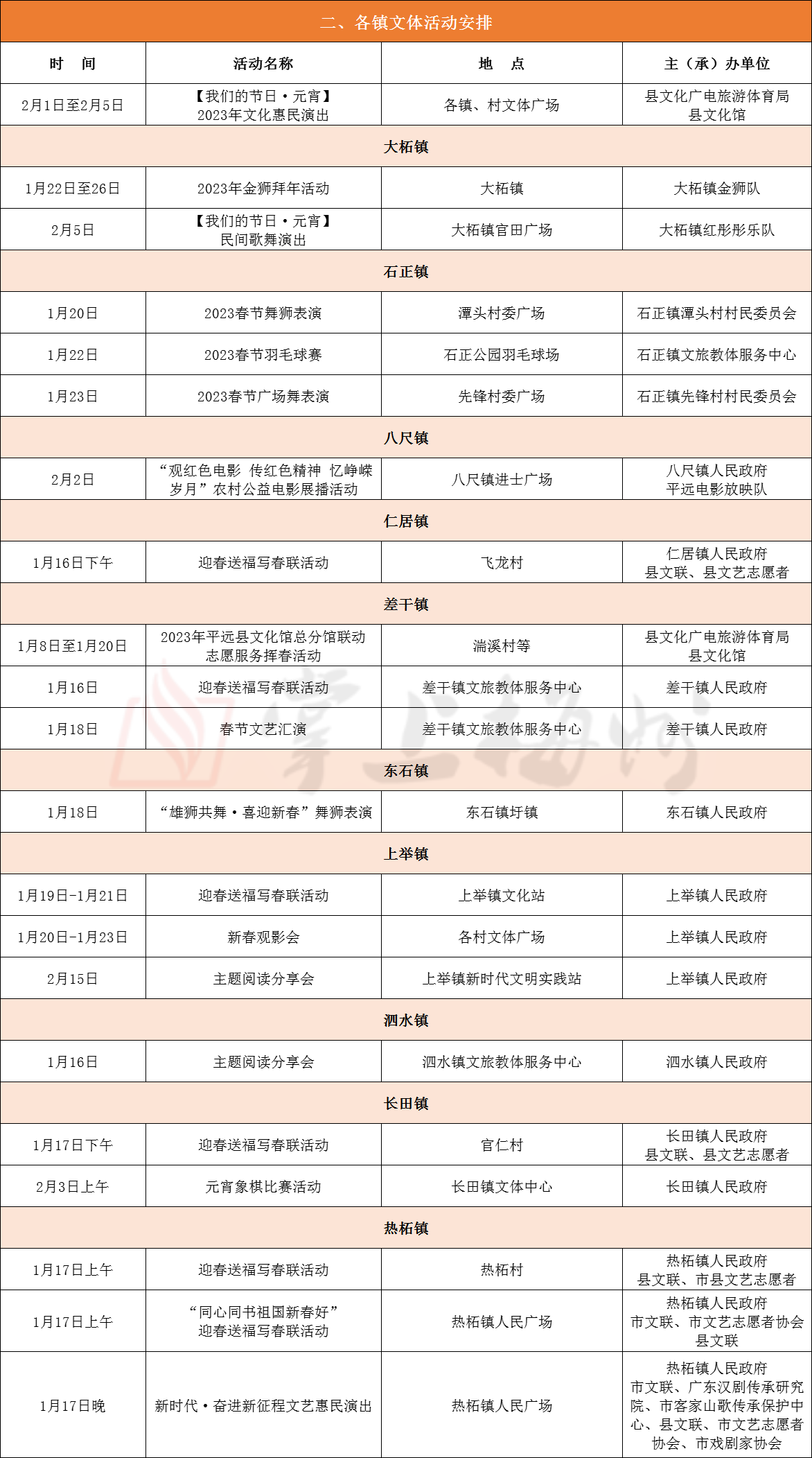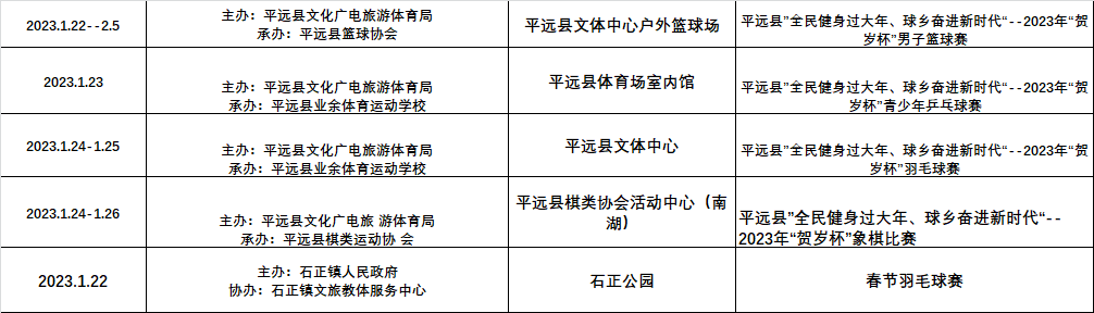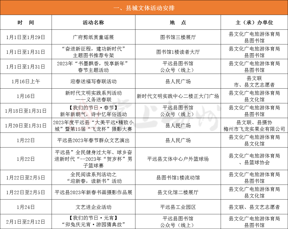 掌上梅州讯 近日,中共平远县委宣传部印发了《平远县2023年春节、元宵系列文体活动安排表》的通知(以下简称《通知》)。《通知》指出,根据省、市、县有关工作部署,平远决定春节、元宵期间在全县范围内广泛开展超过30余项各类文体活动,旨在进一步丰富和活跃全县人民群众的精神文化生活,大力营造欢乐祥和的节日氛围,让广大人民群众过一个欢乐、和谐、文明、安全的新春佳节。具体活动安排如下: