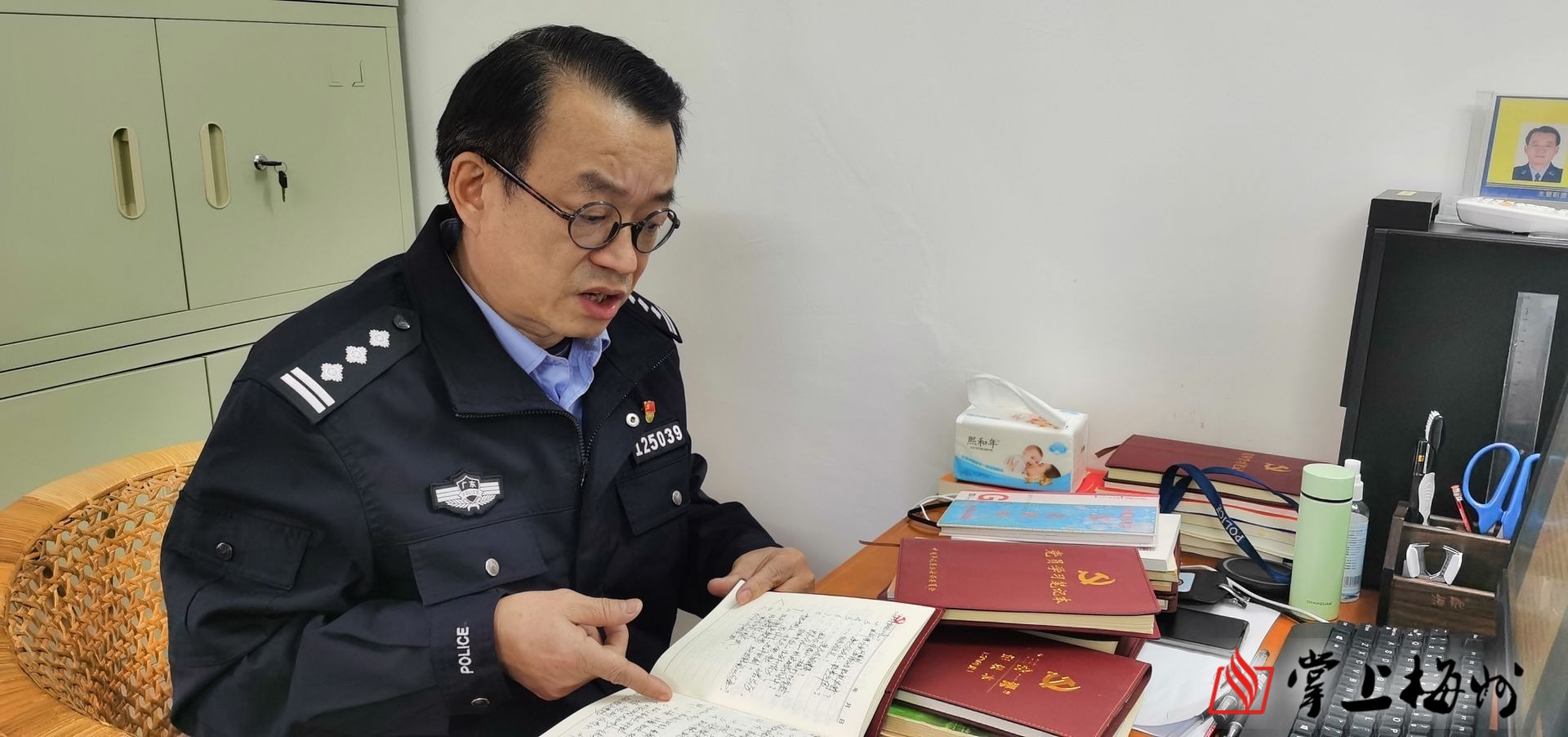 1988年,23岁的钟雄辉从广东司法警察学校毕业分配至蕉岭监狱工作,1993年调回平远公安局工作至今。34年,他从小张变成了老张,青丝熬成了白发;34年,他先后在基层派出所、刑事侦查、安全保卫、法制案审、警务督查等多个岗位担任要职,工作笔记就记了50多本。手写的工作笔记,清楚记录着从警点滴,被他视为警察生涯宝贵的财富。他说:“只要热爱,就能坚持。”