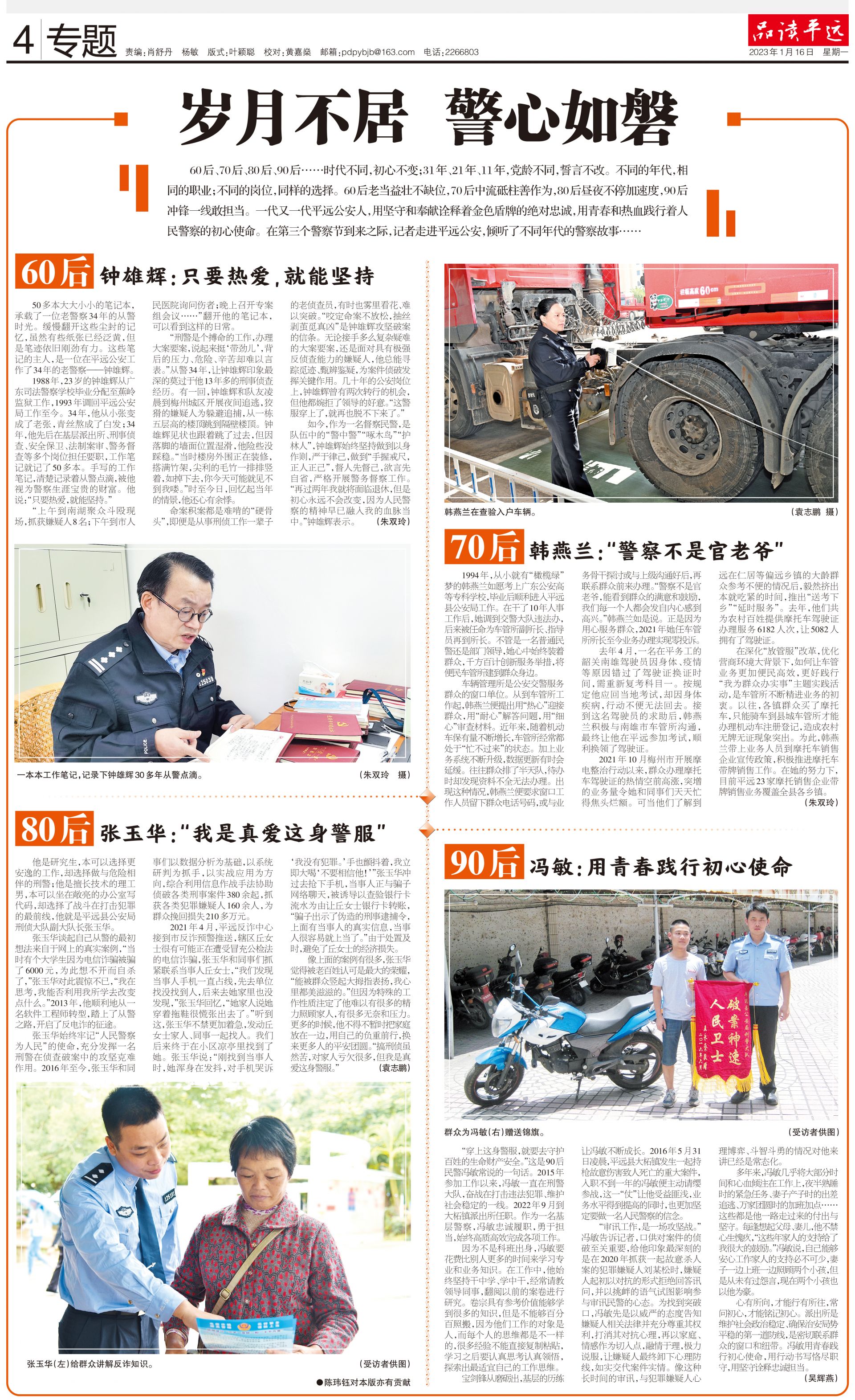 60后、70后、80后、90后……时代不同,初心不变;31年、21年、11年,党龄不同,誓言不改。不同的年代,相同的职业;不同的岗位,同样的选择。60后老当益壮不缺位,70后中流砥柱善作为,80后昼夜不停加速度,90后冲锋一线敢担当。一代又一代平远公安人,用坚守和奉献诠释着金色盾牌的绝对忠诚,用青春和热血践行着人民警察的初心使命。在第三个警察节到来之际,记者走进平远公安,倾听了不同年代的警察故事……