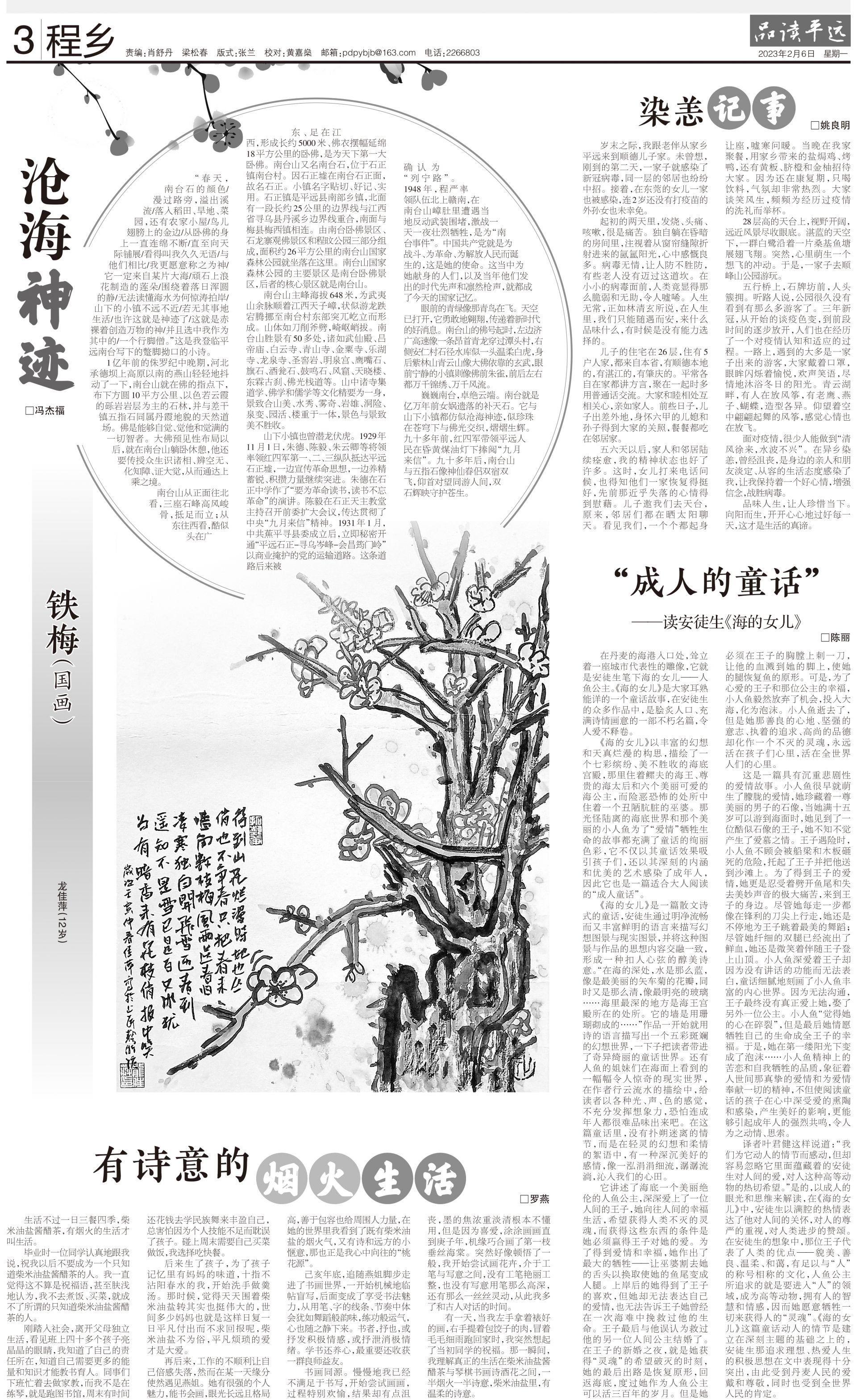 “春天,南台石的颜色/漫过路旁,溢出溪流/落入稻田、旱地、菜园,还有农家小屋/鸟儿翅膀上的金边/从卧佛的身上一直连绵不断/直至向天际铺展/看得叫我久久无语/与他们相比/我更愿意称之为神/它一定来自某片大海/顽石上浪花制造的莲朵/围绕着落日浑圆的静/无法读懂海水为何惊涛拍岸/山下的小镇不远不近/若无其事地生活/也许这就是神迹了/这就是赤裸着创造万物的神/并且选中我作为其中的/一个行脚僧。”这是我登临平远南台写下的蹩脚拗口的小诗。