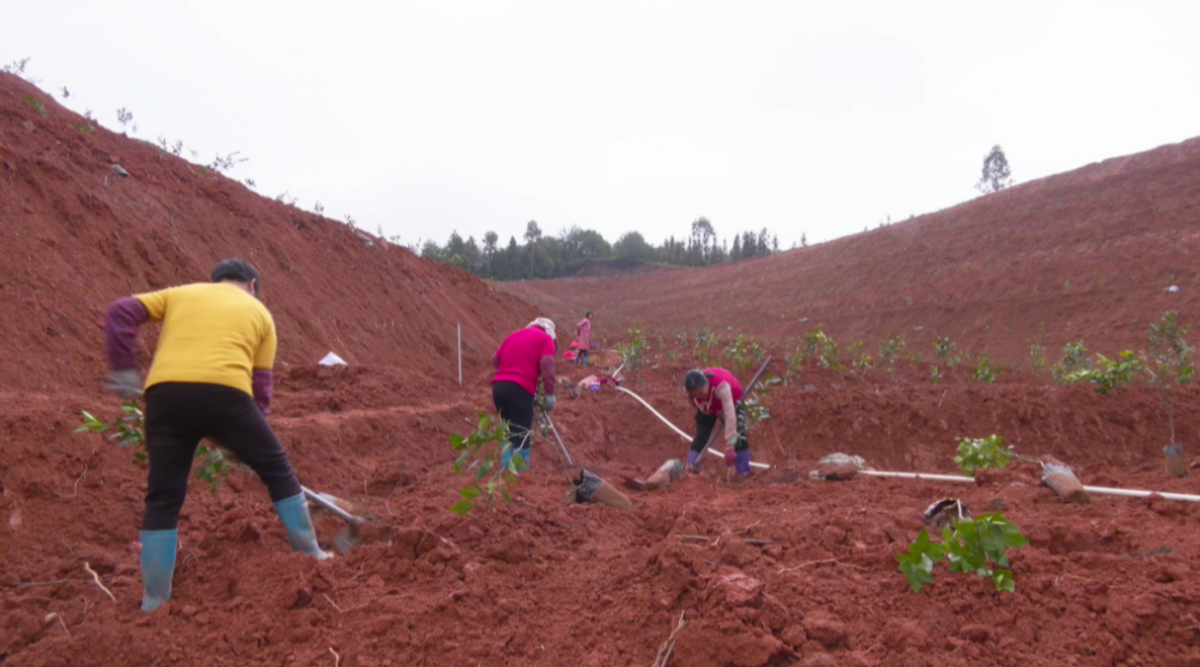 在八尺镇南塘村博厦农林脐橙种植园,记者看到,村民们挥锄扬锹,整穴、填土、施肥……栽下一棵棵脐橙树苗。