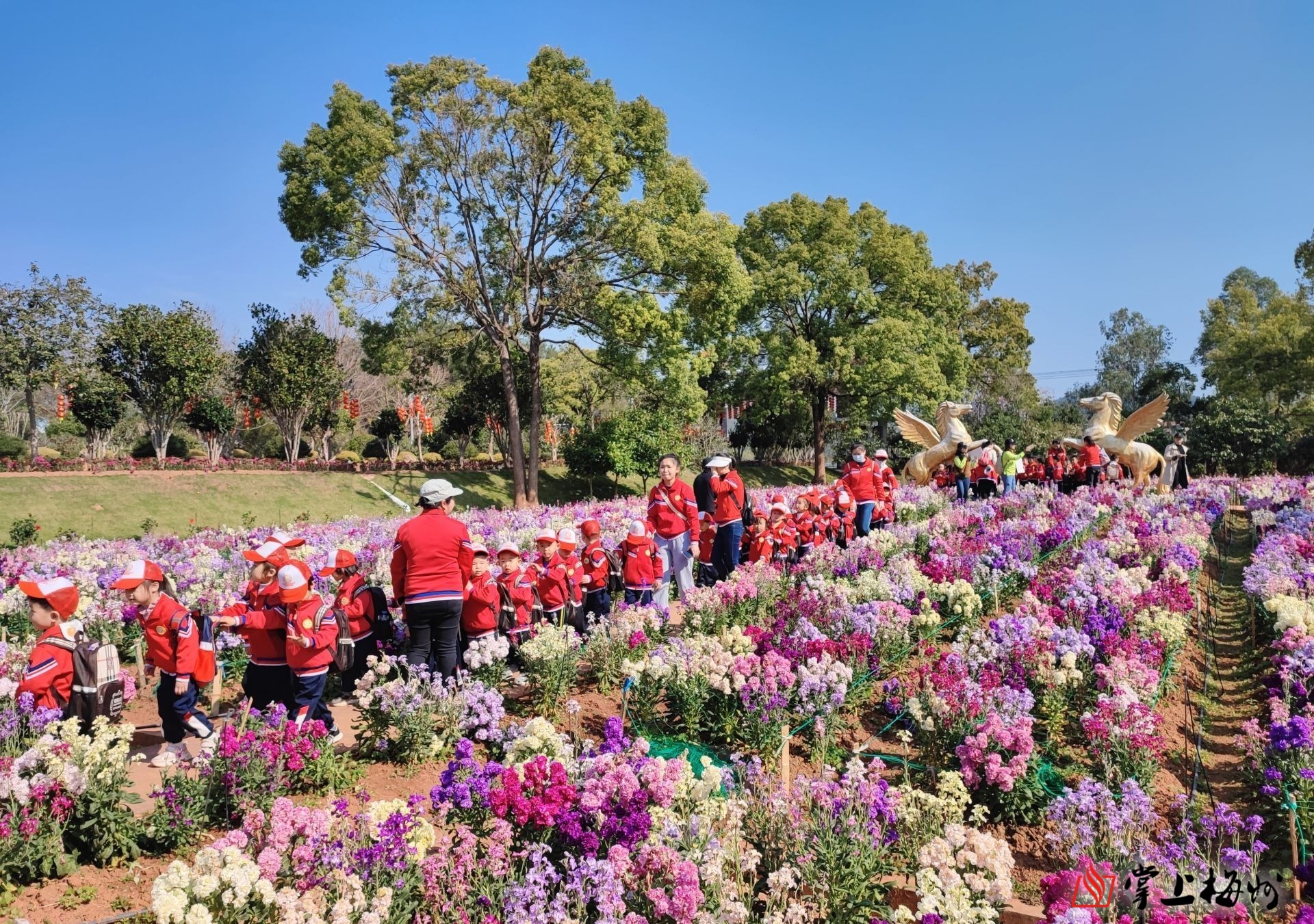 在位于长田镇曼佗山庄景区的百亩花海内,上万株鲜花竞相开放,紫罗兰、金鱼草、石竹花等各类时花姹紫嫣红、交相辉映,层层叠叠、团团簇簇,构成如诗如画的梦幻花海。微风吹来,花枝轻颤,芬芳怡人,人们漫步花海,享受满园春色,感受春天的勃勃生机。