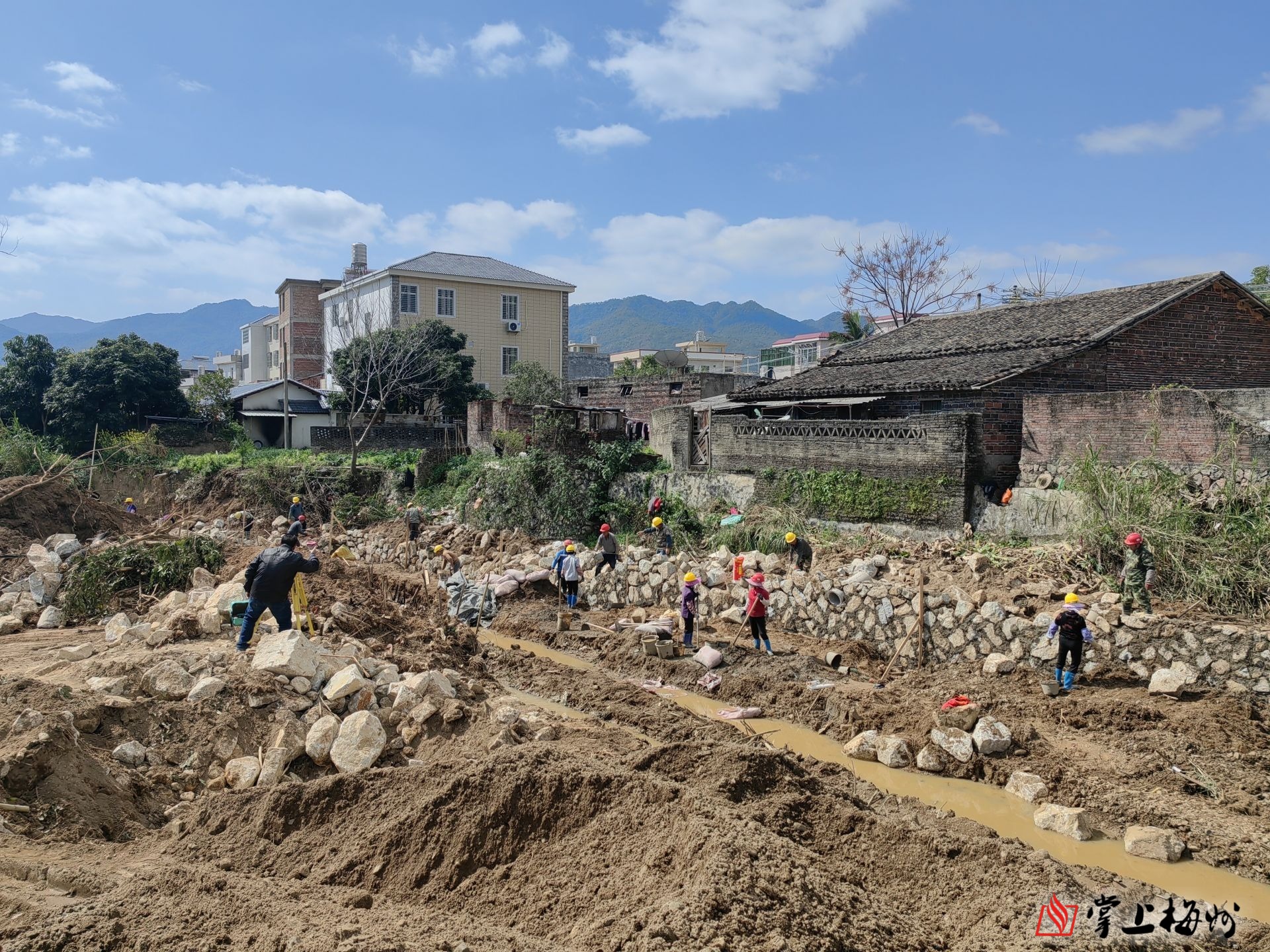 在东石河段治理施工现场,几十名工人正在建设堤防和护岸。(朱双玲 摄)