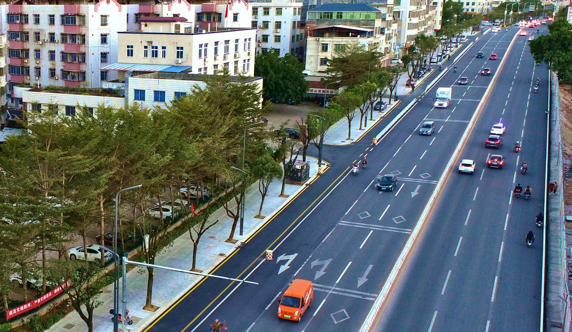 “主路灯采用9+6双头路灯,增加了亮度,交叉路口设置3盏高亮灯,保证夜间行车有充分照明。”田进指着新装的路灯说,“人行道设置的庭院灯有平远脐橙元素,兼顾照明和景观效果。”此次改造重新安装了约250盏双挑臂路灯及庭院灯。同时,新种植的桂花、香樟、大叶榕、黄花风铃木和红粉佳人等路树也进一步扮靓了城市。