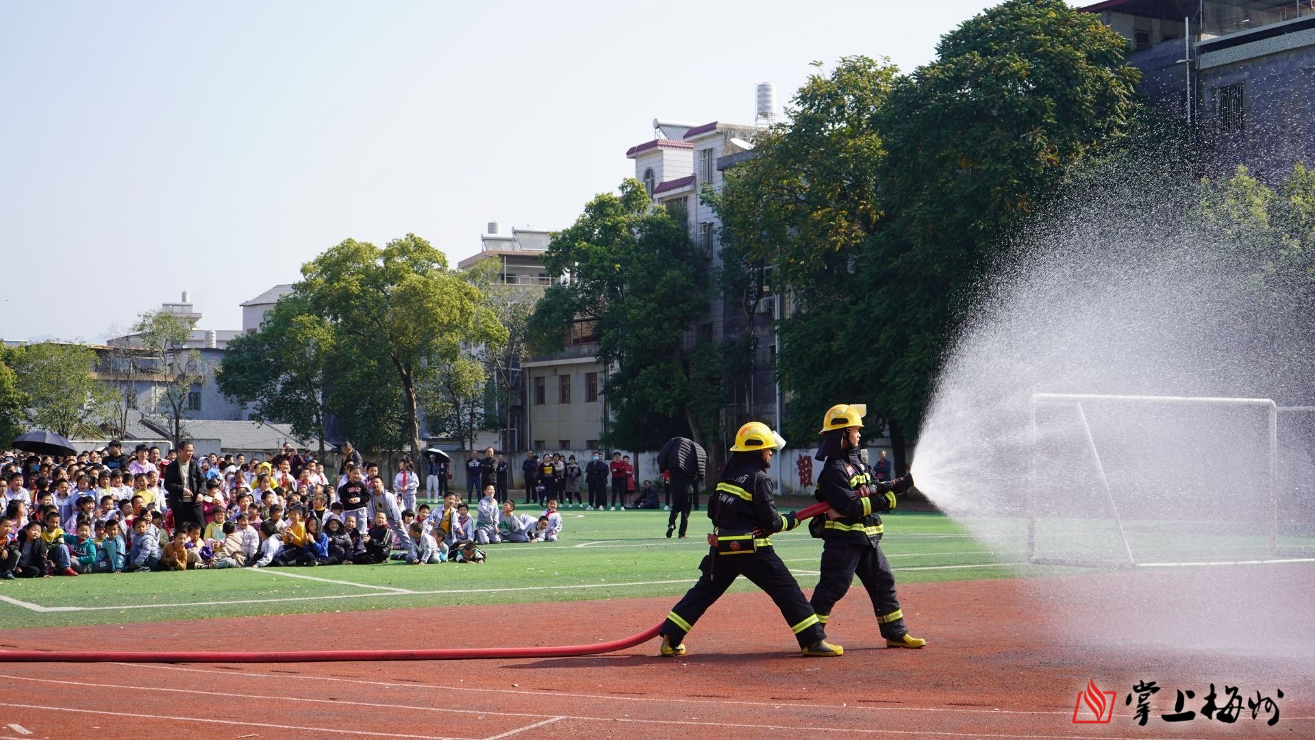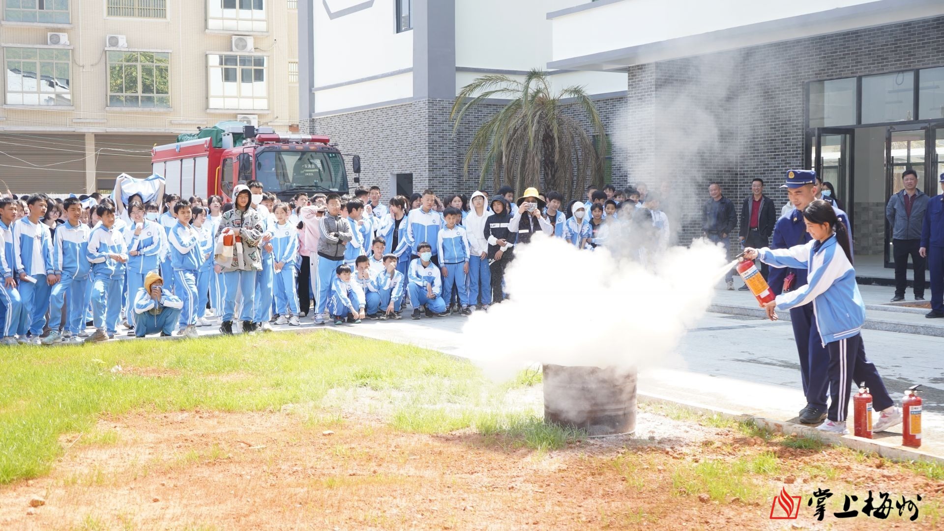 9时40分,学校的警报声突然响起:“同学们,学校发生火情,请全体学生和老师马上撤离到操场的空旷地带……”在消防员的组织引导下,师生们手捂口鼻,紧张有序撤离“火灾”现场。