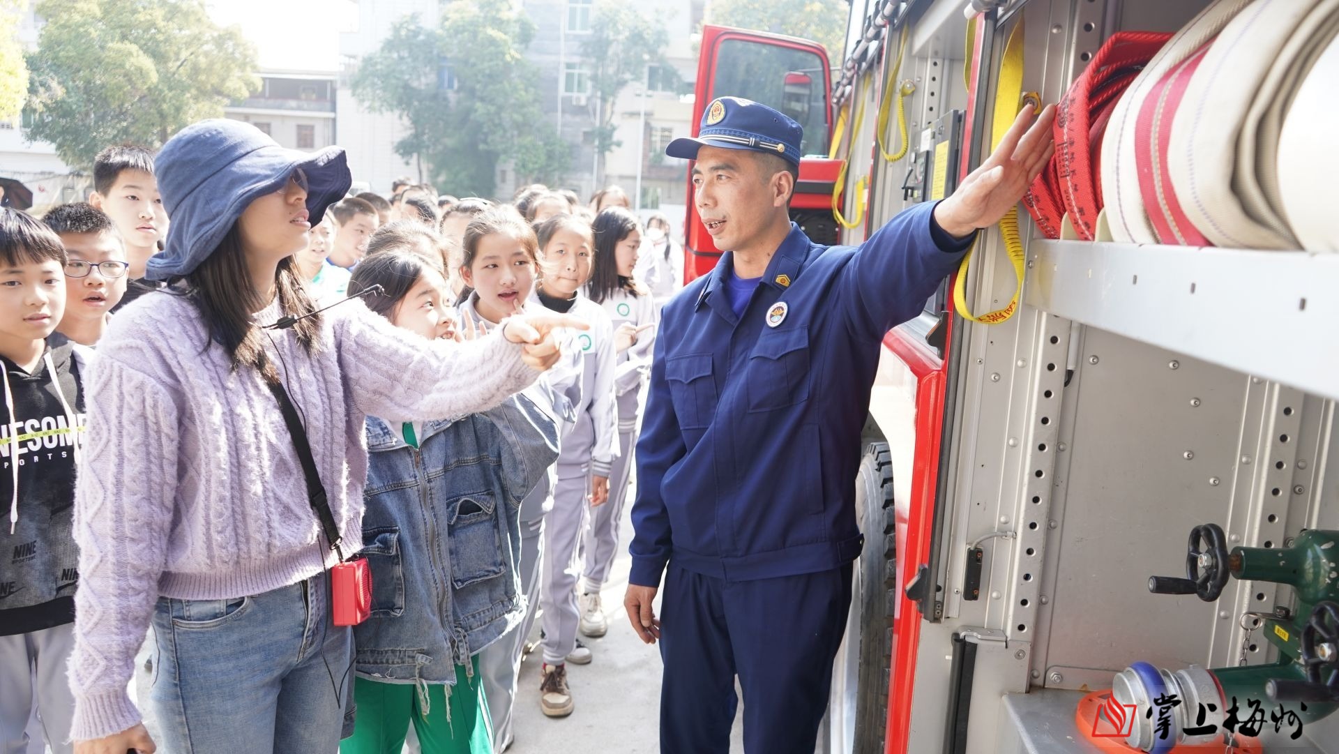 随后,消防员为大家演示初期火灾扑救操作方法,并组织师生们参观消防车,学生们被各式各样的消防救援装备深深吸引,争先恐后地向消防员提出各类的消防问题,现场气氛热烈。