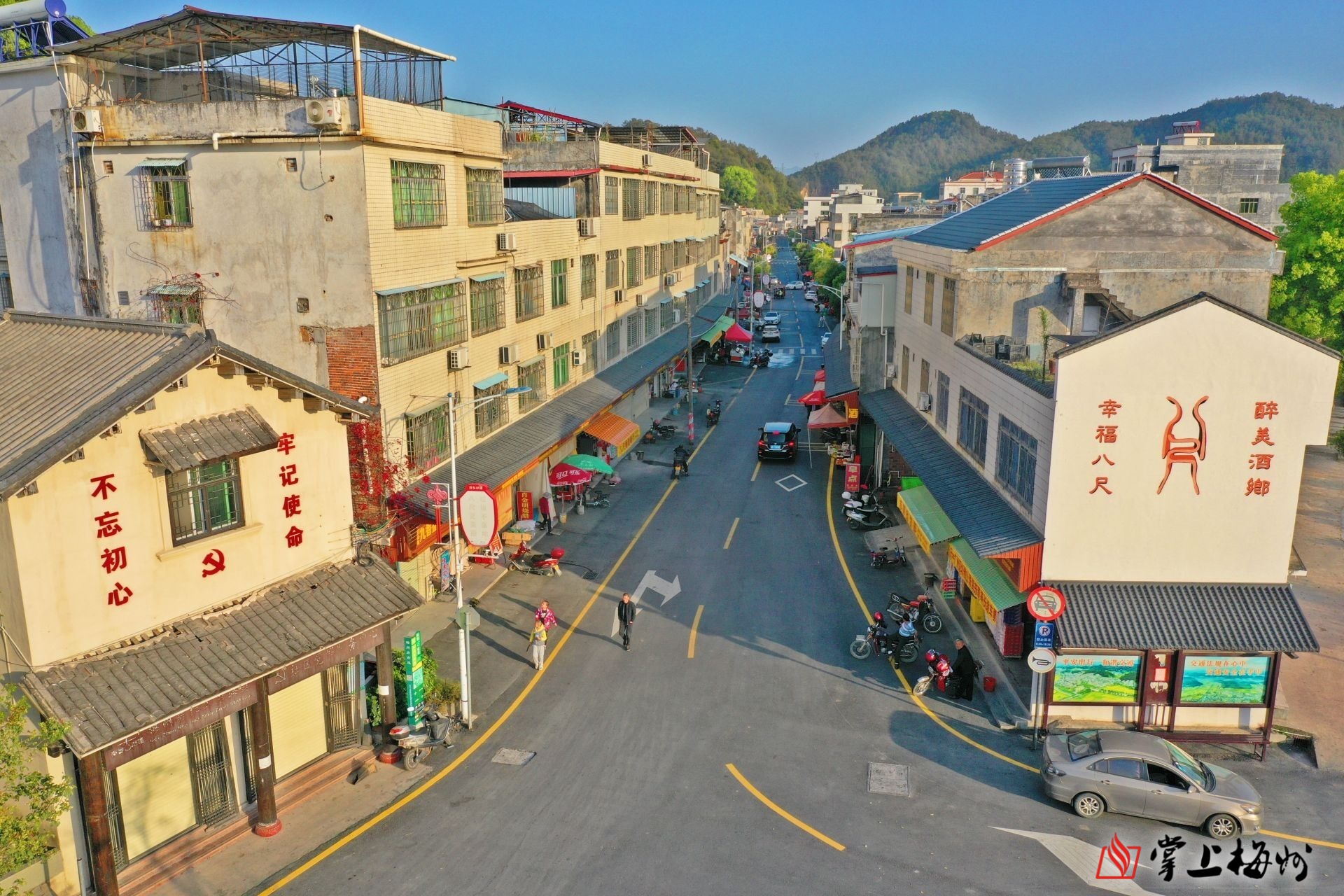 平远县八尺镇,“酒乡”元素的墙绘和酒壶景观出现在道路两旁;硬底化路面平整开阔,店肆整齐排列,热闹非凡。商家韩先生站在店门口,热情地招呼顾客。
