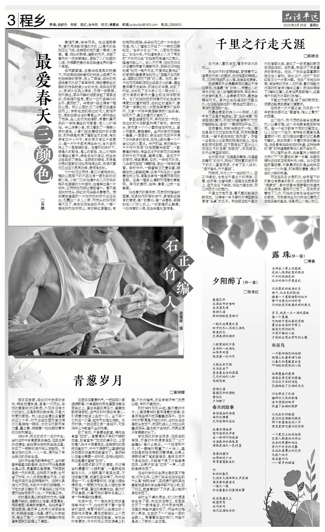 站在春天的幕帘前,观赏柳树描绘的图景,阅读桃花抒写的诗行,感悟梨白隐含的意境,每一刻春光,每一朵春色,都镌刻在人们的心坎上,一切都是那么静美,一如诗意的小调,在生命里永恒传唱。