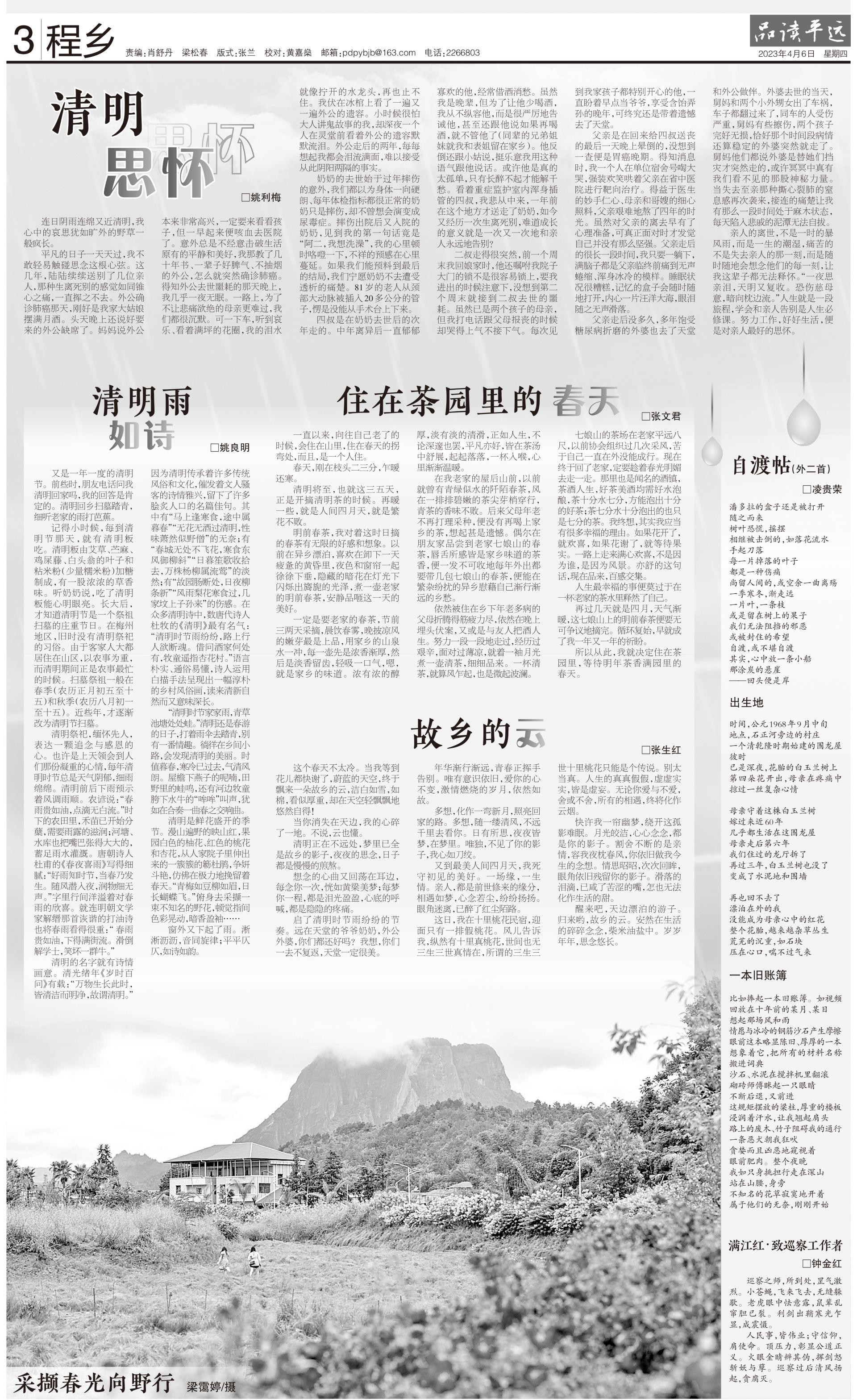 清明是鲜花盛开的季节。漫山遍野的映山红,果园白色的柚花、红色的桃花和杏花,从人家院子里伸出来的一簇簇的簕杜鹃,争妍斗艳,仿佛在极力地挽留着春天。“青梅如豆柳如眉,日长蝴蝶飞。”俯身去采撷一束不知名的野花,顿觉指间色彩晃动,暗香盈袖……