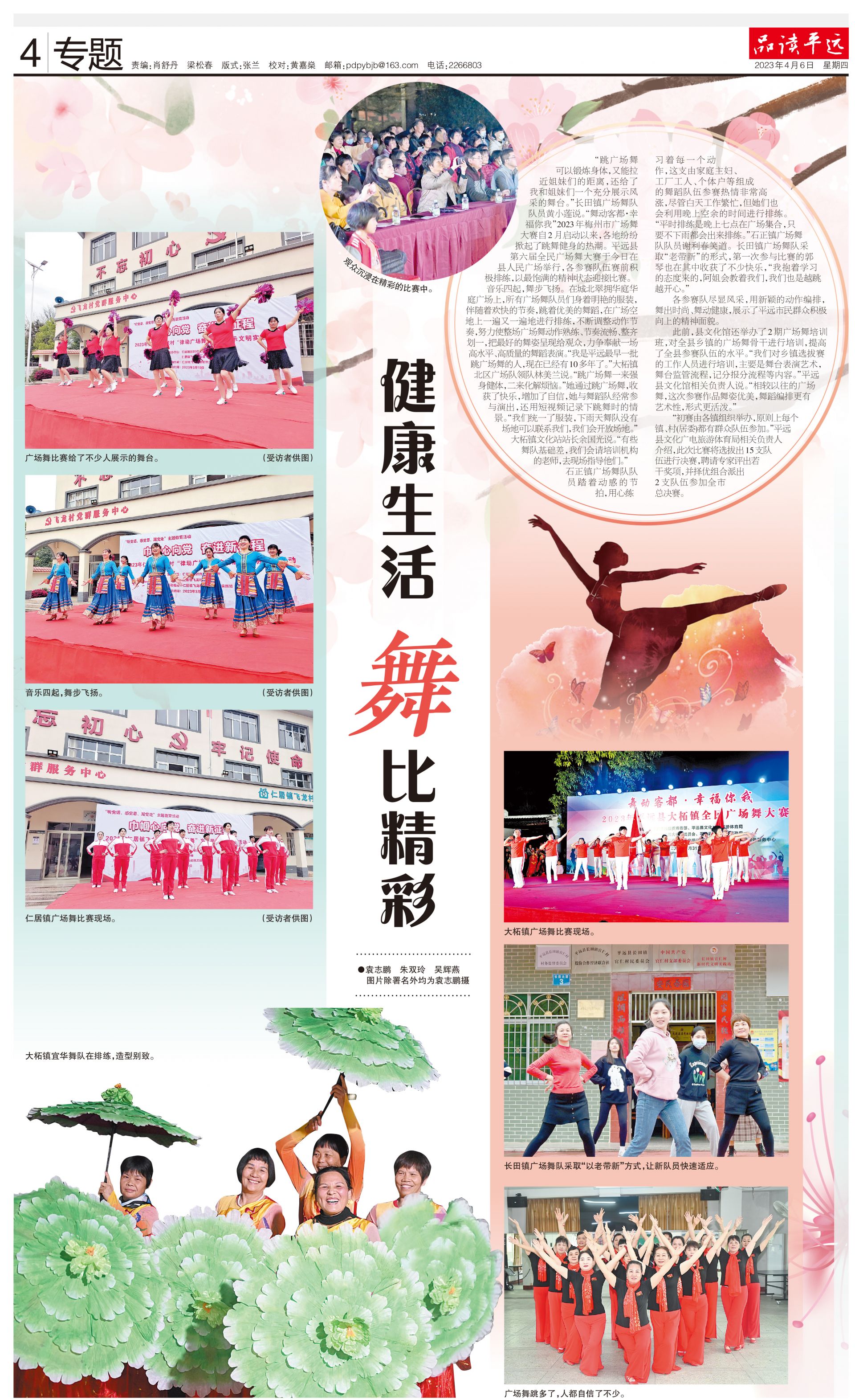 音乐四起,舞步飞扬。在城北翠拥华庭华庭广场上,所有广场舞队员们身着明艳的服装,伴随着欢快的节奏,跳着优美的舞蹈,在广场空地上一遍又一遍地进行排练,不断调整动作节奏,努力使整场广场舞动作熟练、节奏流畅、整齐划一,把最好的舞姿呈现给观众,力争奉献一场高水平、高质量的舞蹈表演。“我是平远最早一批跳广场舞的人,现在已经有10多年了。”大柘镇北区广场队领队林美兰说。“跳广场舞一来强身健体,二来化解烦恼。”她通过跳广场舞,收获了快乐,增加了自信,她与舞蹈队经常参与演出,还用短视频记录下跳舞时的情景。“我们统一了服装,下雨天舞队没有场地可以联系我们,我们会开放场地。”大柘镇文化站站长余国光说。“有些舞队基础差,我们会请培训机构的老师,去现场指导他们。”