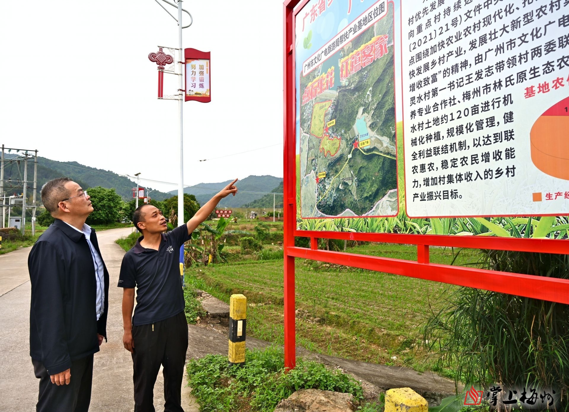 王发志(右)跟工作队员一起查看灵水村产业帮扶基地情况。 (袁志鹏 摄)
