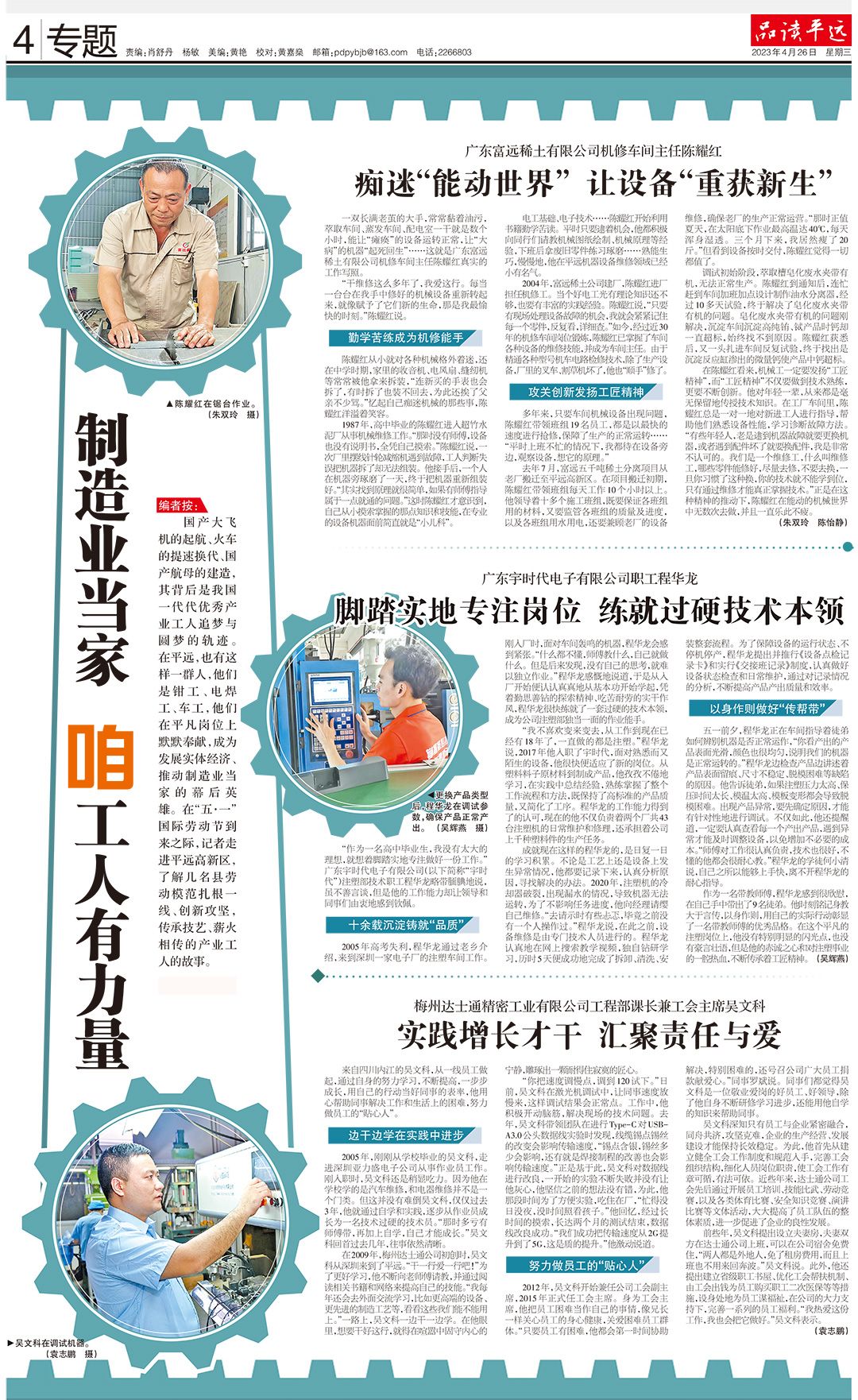 电工基础、电子技术……陈耀红开始利用书籍勤学苦读。平时只要逮着机会,他都积极向同行们请教机械图纸绘制、机械原理等经验,下班后拿废旧零件练习琢磨……熟能生巧,慢慢地,他在平远机器设备维修领域已经小有名气。
