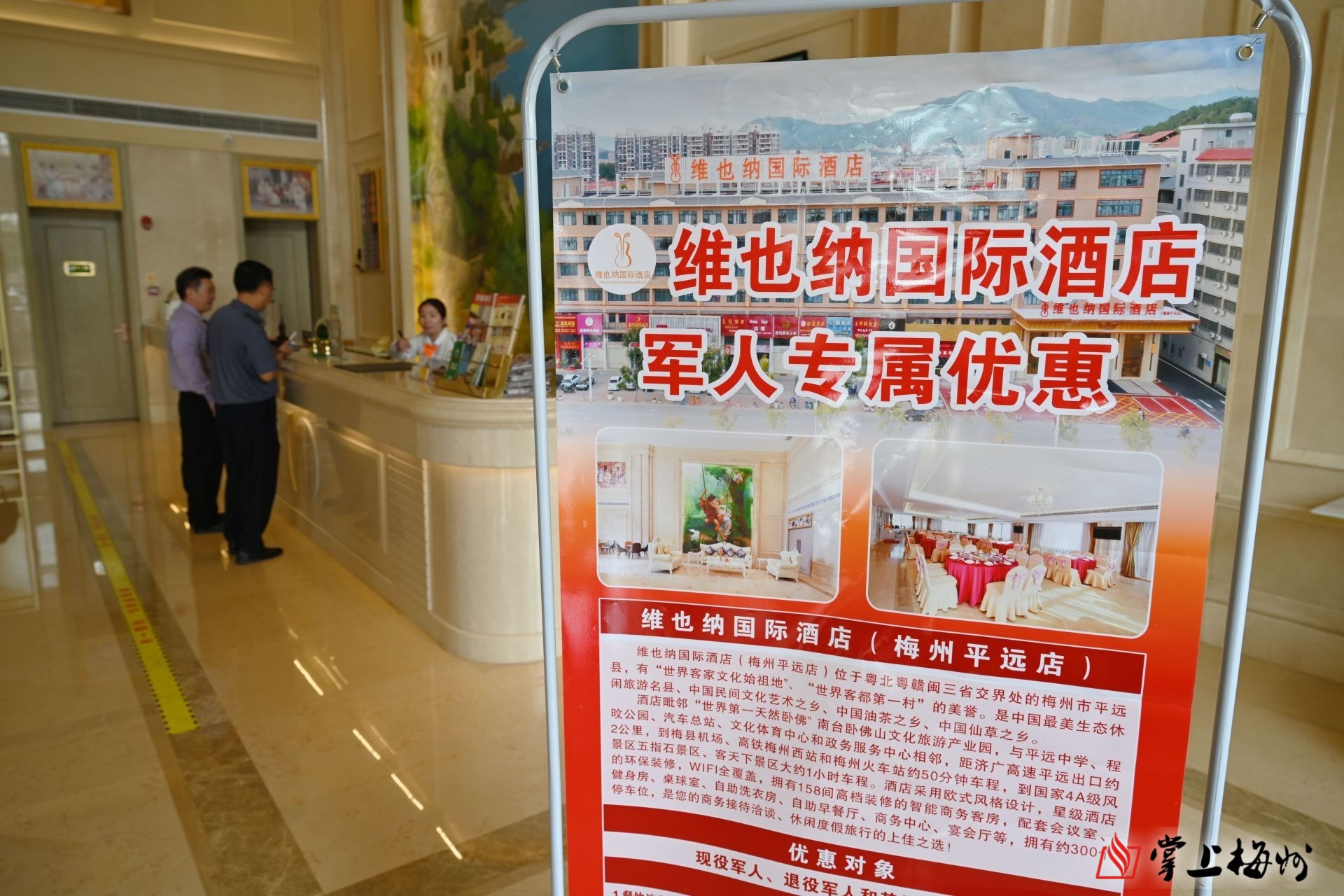 平远县维也纳国际酒店大堂前台,军人专属优惠活动的宣传牌很是醒目。