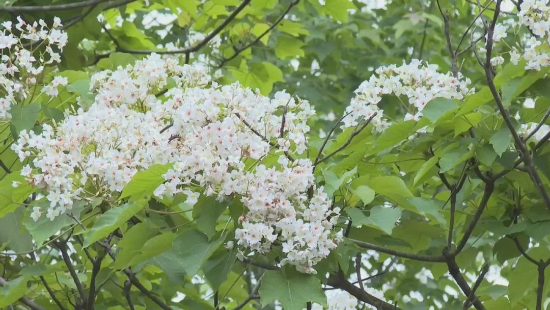 步入五指石景区,沿着山路一路前行,油桐花清香袭来,还夹杂着雨后泥土的气息。仰望树梢,白色的花球挂满枝头,一团团、一簇簇,近看之,白色的花瓣中还透出一丝淡红,一份淡黄,似情窦初开的少女,安静而淡雅。随着春风,油桐花也在酿一场花雨,洁白的花朵如飘雪般落下,铺满了树周的大片土地,花开花落,成了景区一道亮眼的“雪”景,吸引了前来游玩的游客驻足欣赏,拍照留念。