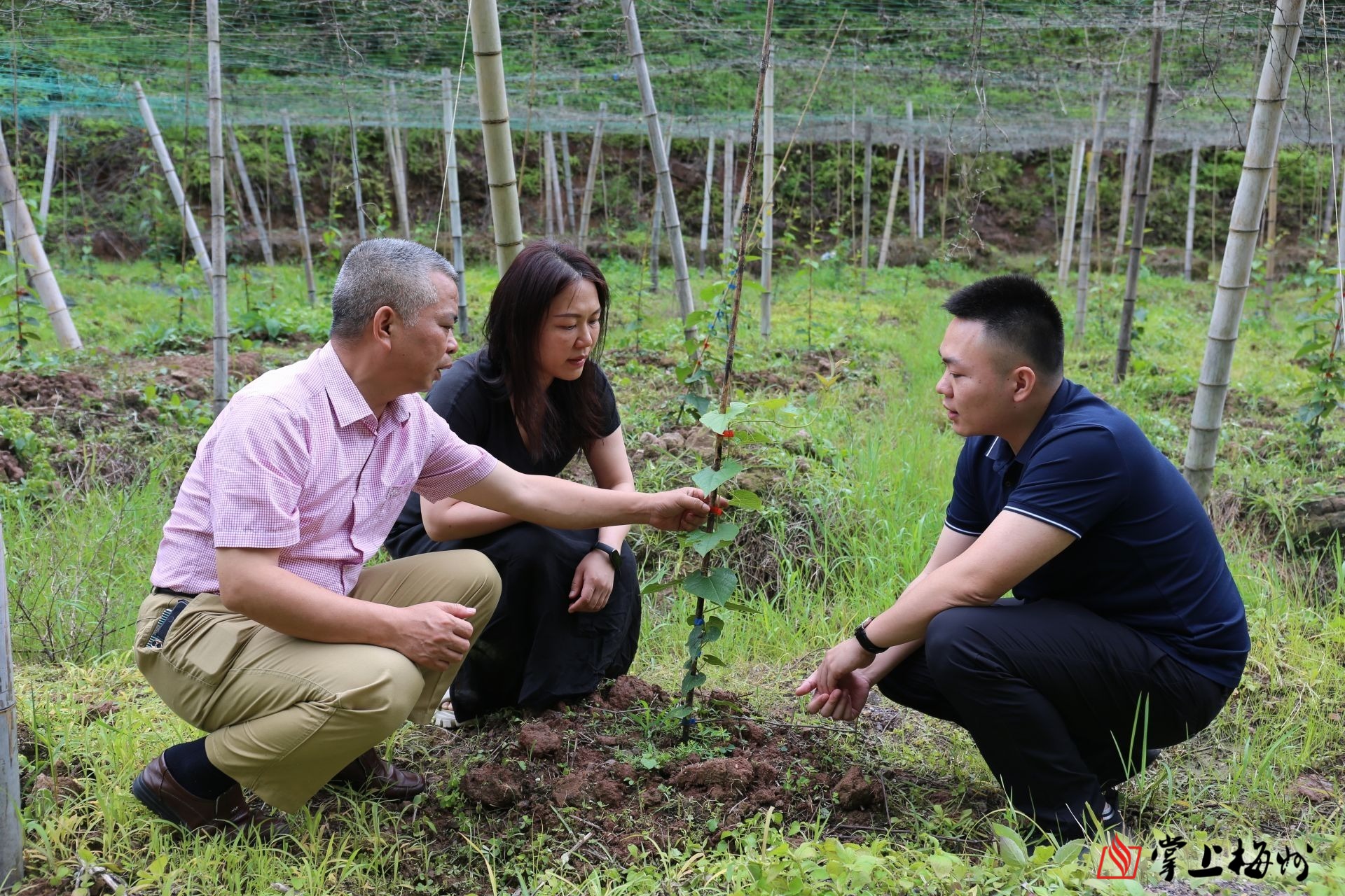 工作队在大柘镇漳演村罗汉果种植基地调研果苗生长情况。(吴辉燕 摄)