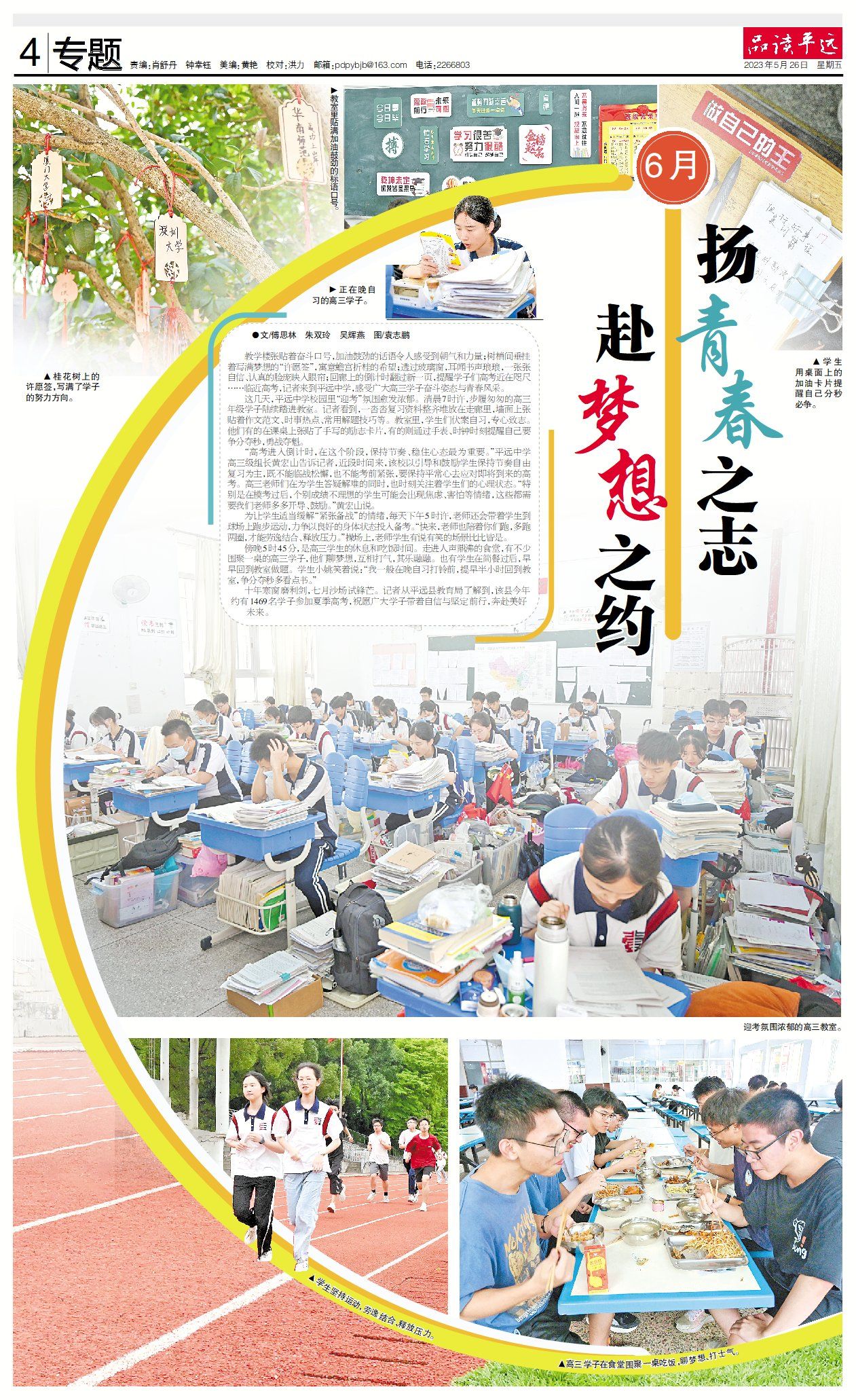 教学楼张贴着奋斗口号,加油鼓劲的话语令人感受到朝气和力量;树梢间垂挂着写满梦想的“许愿签”,寓意蟾宫折桂的希望;透过玻璃窗,耳闻书声琅琅,一张张自信、认真的脸庞映入眼帘;回廊上的倒计时翻过新一页,提醒学子们高考近在咫尺……临近高考,记者来到平远中学,感受广大高三学子奋斗姿态与青春风采。