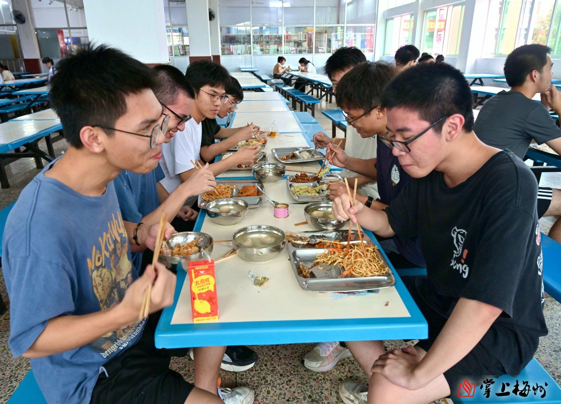 高三学子在食堂围聚一桌吃饭,聊梦想、打士气。