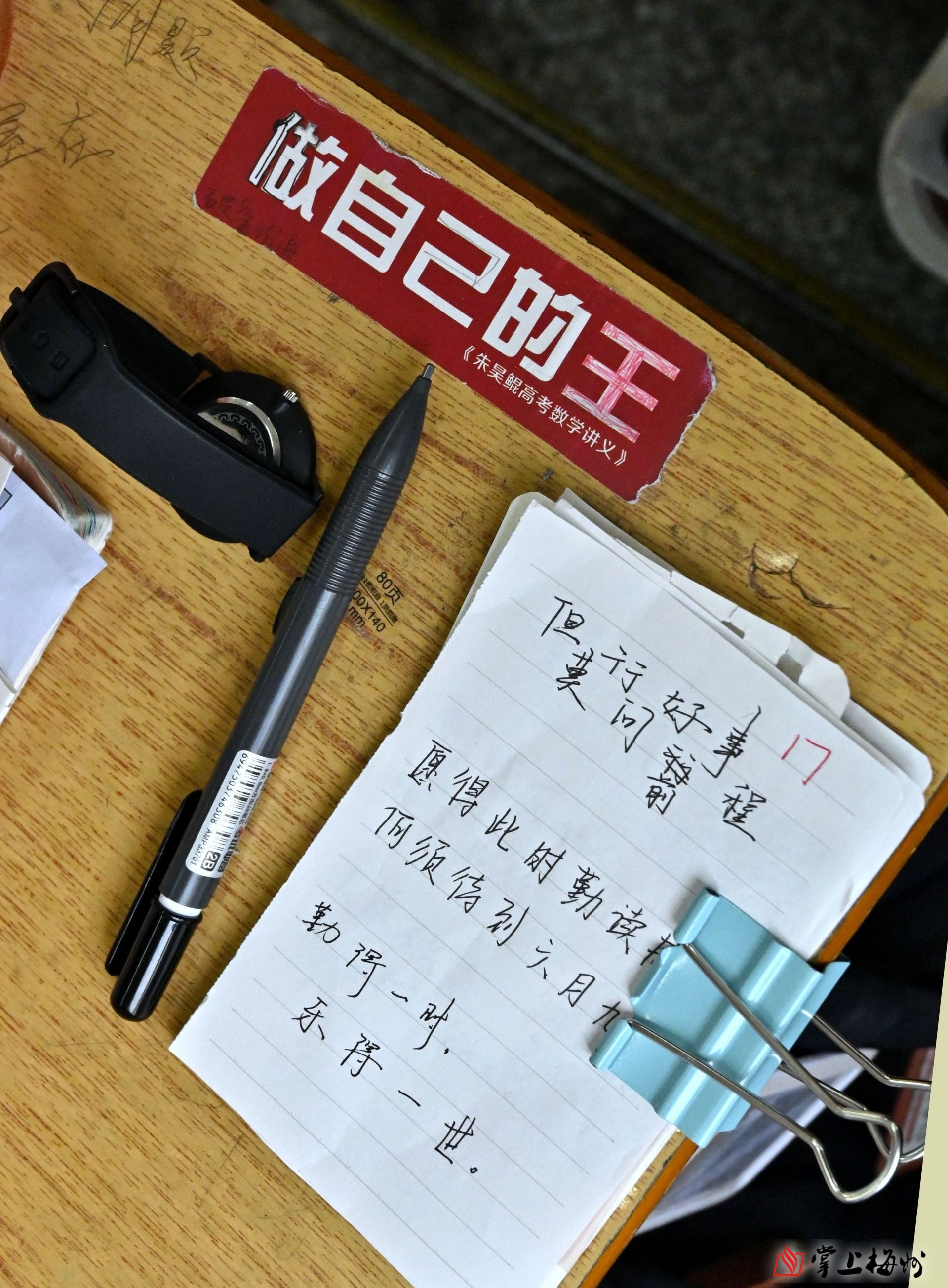 学生用桌面上的加油卡片提醒自己分秒必争。