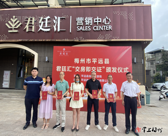 为贯彻落实《梅州市不动产登记“极简审批”改革工作实施方案》,平远县开展“交房即交证”常态化运作。2023年6月18日上午,在君廷汇举办了“交房即交证”颁发仪式,为5户业主现场颁发了不动产权证书。