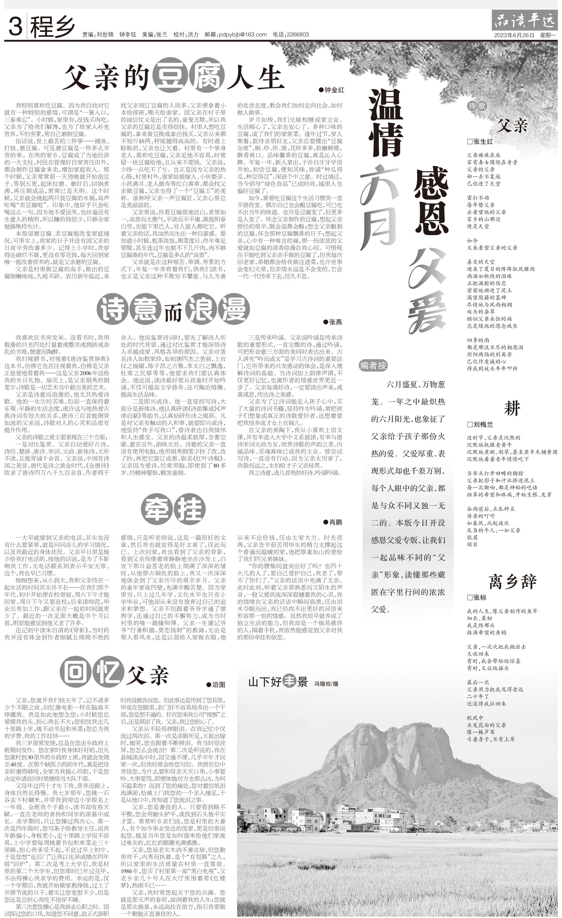 六月盛夏,万物葱茏。一年之中最炽热的六月阳光,也象征了父亲给予孩子那份火热的爱。父爱厚重,表现形式却也千差万别,每个人眼中的父亲,都是与众不同又独一无二的。本版今日开设感恩父爱专版,让我们一起品味不同的“父亲”形象,读懂那些藏匿在字里行间的浓浓父爱。