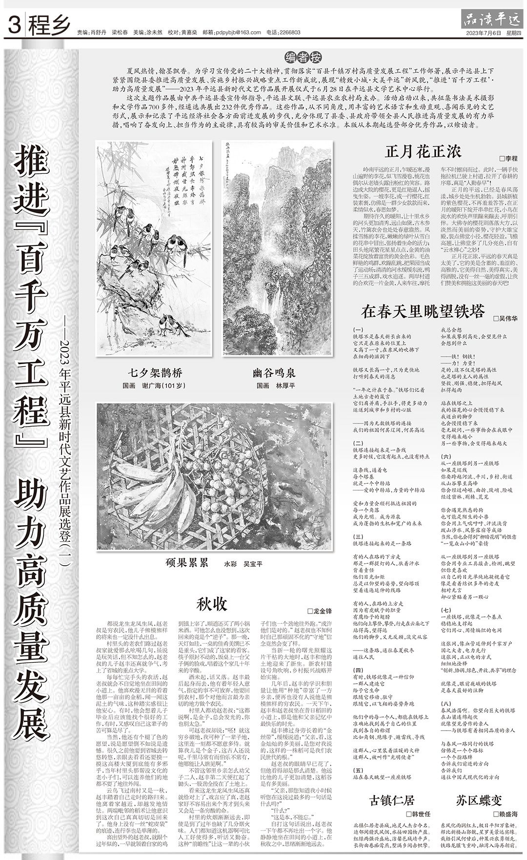 这次主题作品展由中共平远县委宣传部指导,平远县文联、平远县农业农村局主办。活动启动以来,共征集书法美术摄影和文学作品700多件,经遴选共展出232件优秀作品。这些作品,从不同角度,用丰富的艺术语言和生动直观、喜闻乐见的文艺形式,展示和记录了平远经济社会各方面前进发展的步伐,充分体现了县委、县政府带领全县人民推进高质量发展的有力举措,唱响了奋发向上、担当作为的主旋律,具有较高的审美价值和艺术水准。本版从本期起选登部分优秀作品,以飨读者。
