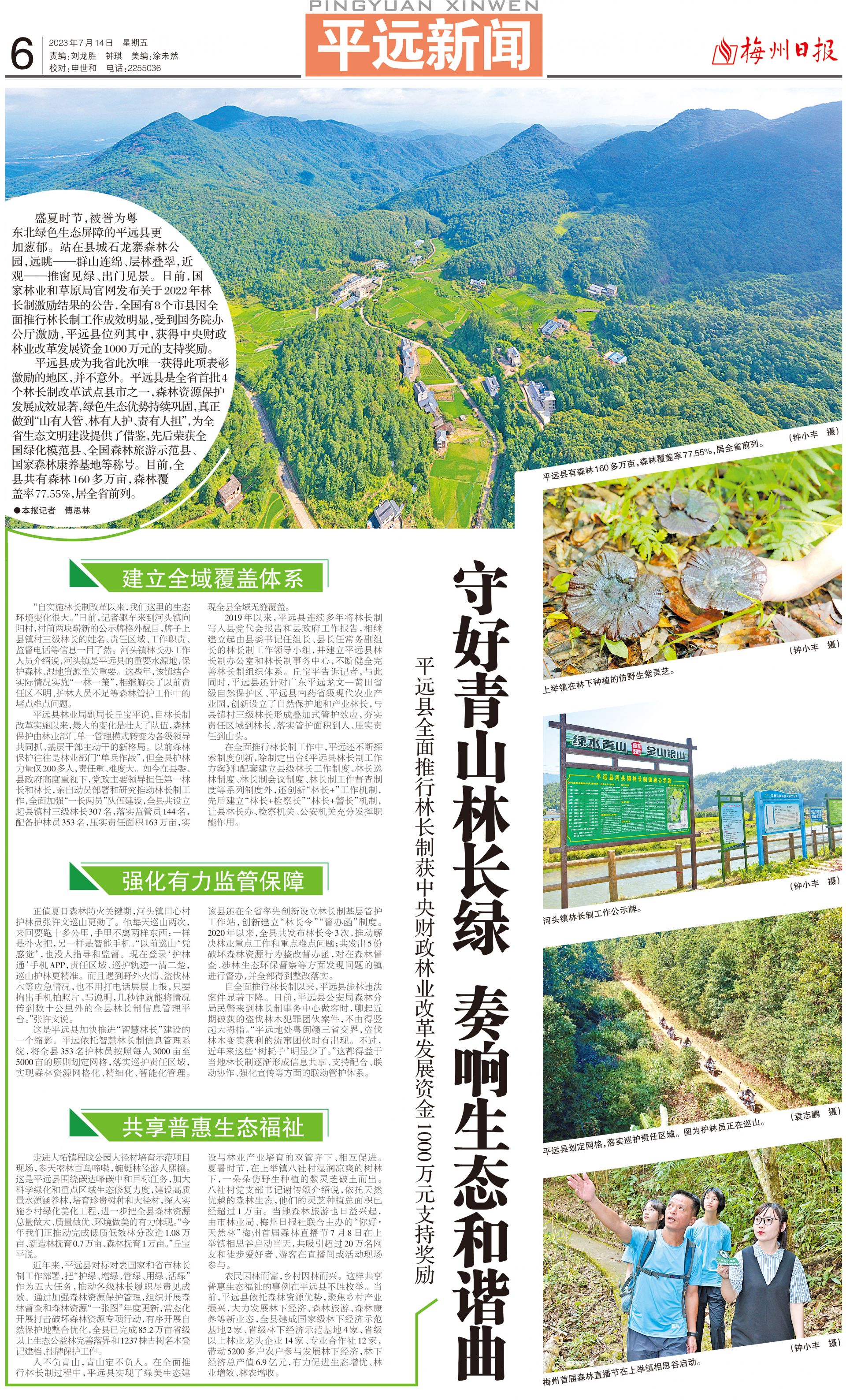 盛夏时节,被誉为粤东北绿色生态屏障的平远县更加葱郁。站在县城石龙寨森林公园,远眺——群山连绵、层林叠翠,近观——推窗见绿、出门见景。日前,国家林业和草原局官网发布关于2022年林长制激励结果的公告,全国有8个市县因全面推行林长制工作成效明显,受到国务院办公厅激励,平远县位列其中,获得中央财政林业改革发展资金1000万元的支持奖励。