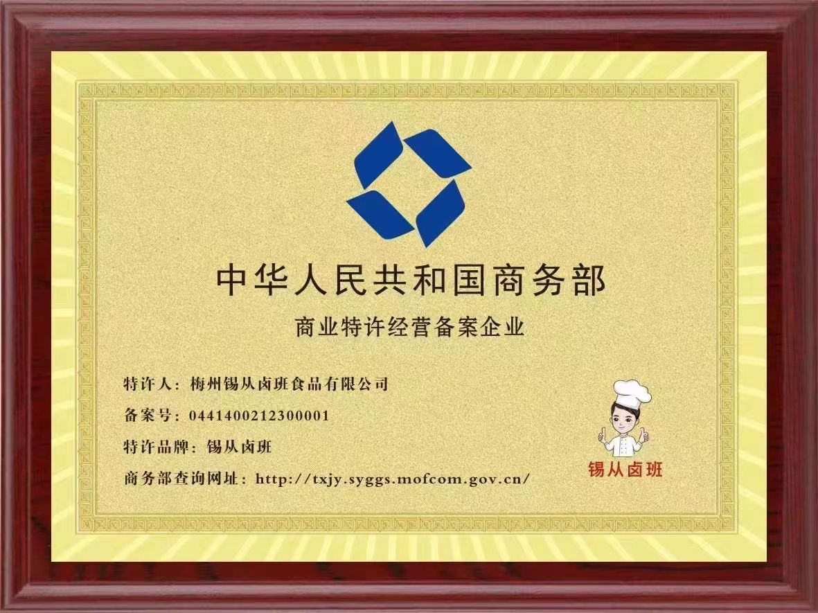 掌上梅州讯 近日,梅州锡从卤班食品有限公司,获批商务部商业特许经营备案,充分肯定了锡从卤班是可以合法开展招商加盟活动的连锁品牌。