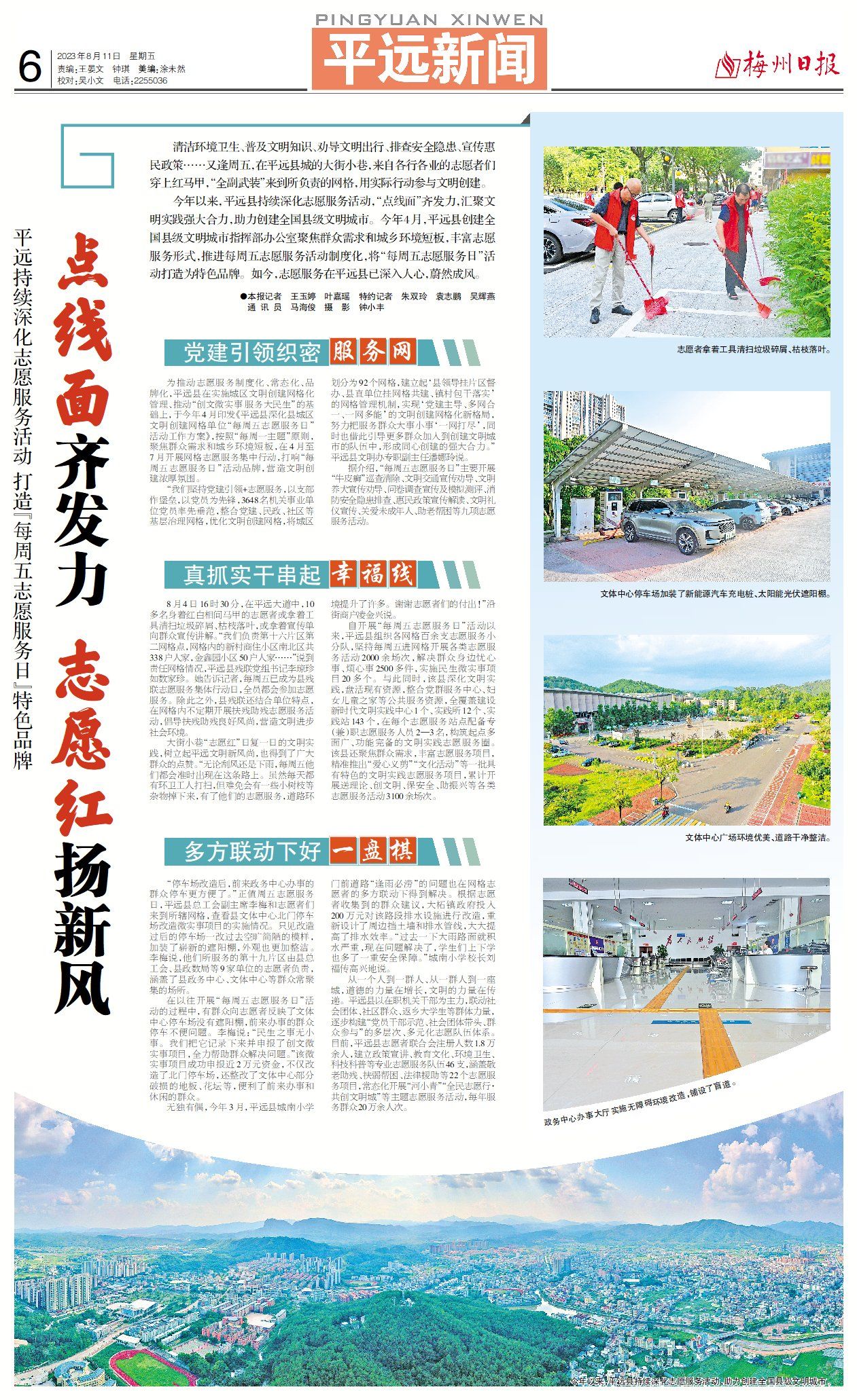 今年以来,平远县持续深化志愿服务活动,“点线面”齐发力,汇聚文明实践强大合力,助力创建全国县级文明城市。今年4月,平远县创建全国县级文明城市指挥部办公室聚焦群众需求和城乡环境短板,丰富志愿服务形式,推进每周五志愿服务活动制度化,将“每周五志愿服务日”活动打造为特色品牌。如今,志愿服务在平远县已深入人心,蔚然成风。