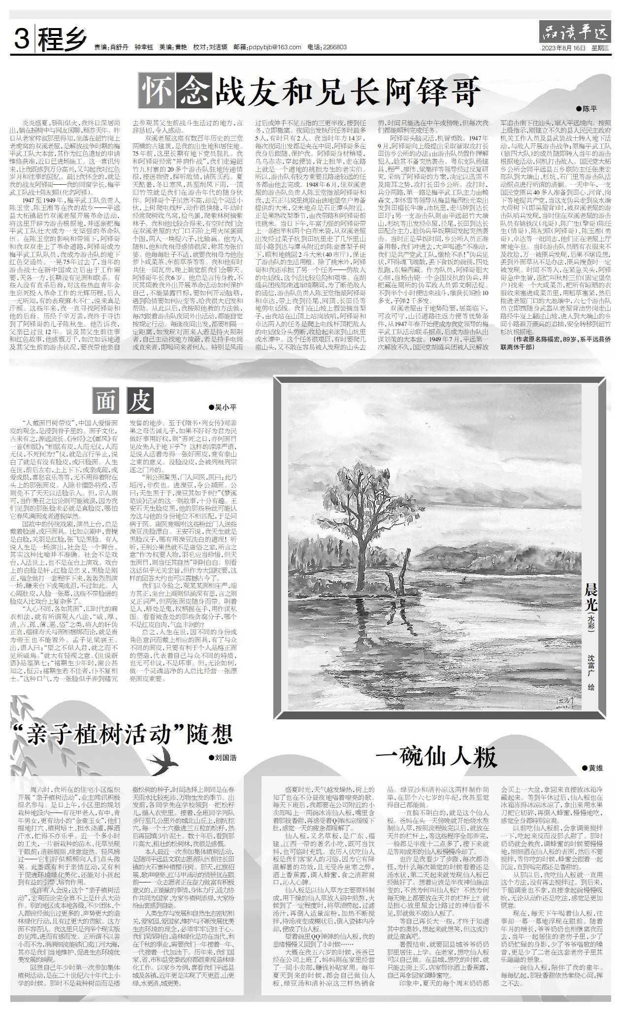 1947至1949年,梅平武工队负责人陈玉堂、陈玉湘等在我的故乡——平远县大柘镇超竹双溪老屋开展革命活动,将这里开辟为游击根据地,并逐渐把梅平武工队壮大成为一支坚强的革命队伍。在陈玉堂的影响和带领下,阿铎哥和我双双走上了革命道路,阿铎哥成为梅平武工队队员,我成为游击队的地下红色交通员。一晃75年过去了,当年的游击战士在新中国成立后由于工作需要,天各一方,长期没有见面和联系。有些人没有直系后裔,对这些热血青年舍生忘死投入革命工作的光辉历程,后人一无所知,有的表现麻木不仁,说来真是汗颜。这些年来,我一直寻找阿铎哥和他的后裔。历经千辛万苦,我终于寻访到了阿铎哥的儿子陈秋生。他告诉我,父亲已过世12年。谈及其父生前往事和红色故事,他感慨万千,如泣如诉地道及其父生前的游击状况,要我带他亲自去参观其父生前战斗生活过的地方,言辞恳切,令人感动。