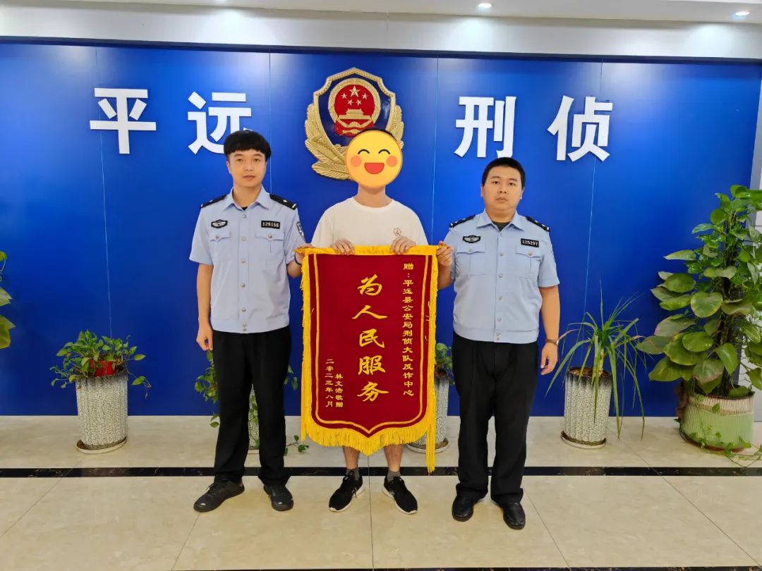 9月12日上午,在外读书的小林同学委托朋友将印有“为人民服务”锦旗交到平远县公安局刑侦大队民警手中,对反诈中心民警的辛劳付出表示由衷感谢。