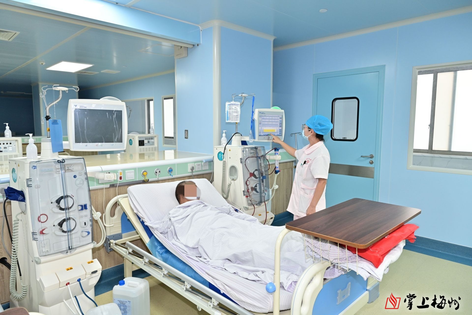 在平远县人民医院,护士用血液透析机给患者进行治疗。