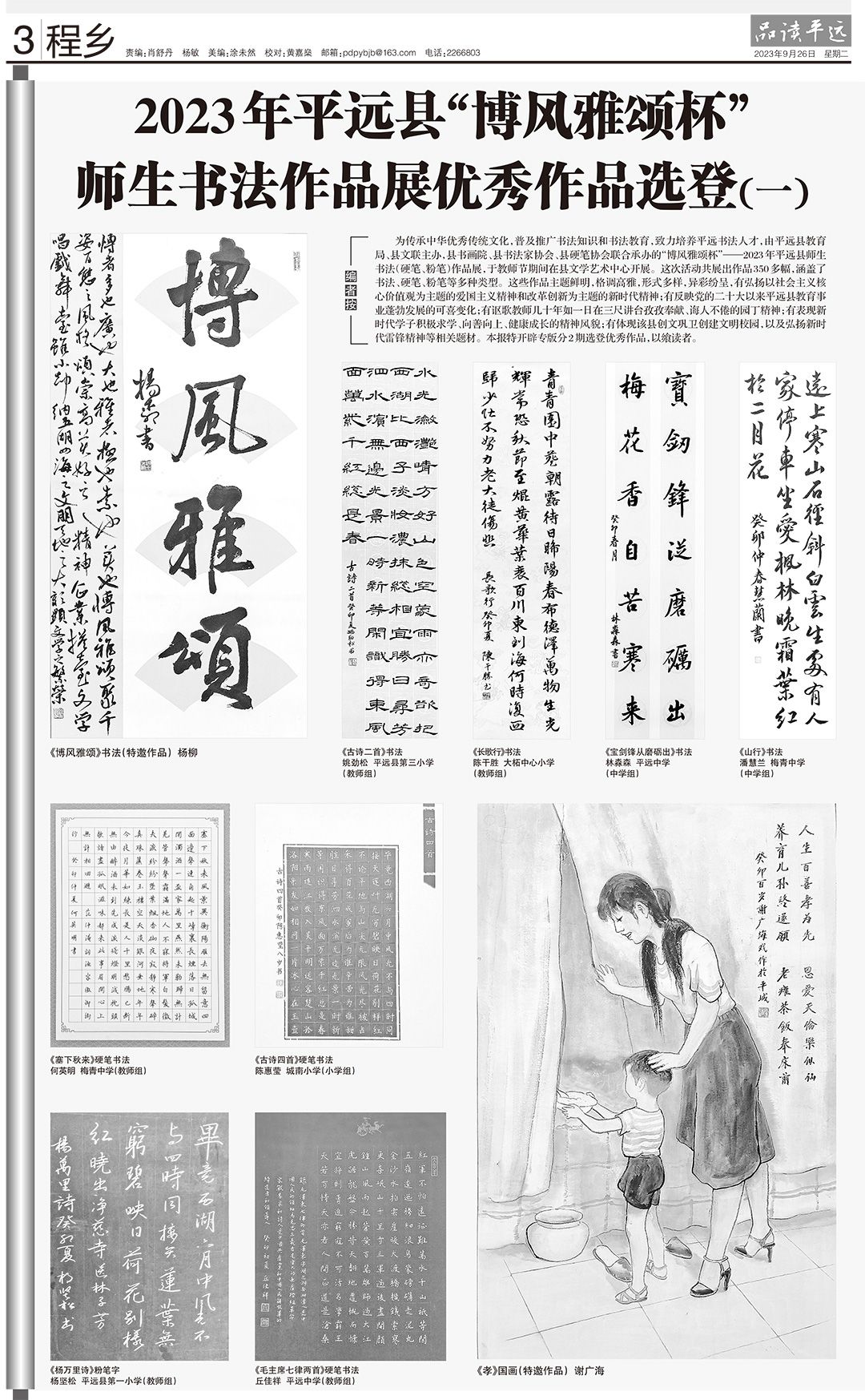 编者按:为传承中华优秀传统文化,普及推广书法知识和书法教育,致力培养平远书法人才,由平远县教育局、县文联主办,县书画院、县书法家协会、县硬笔协会联合承办的“博风雅颂杯”——2023年平远县师生书法(硬笔、粉笔)作品展,于教师节期间在县文学艺术中心开展。这次活动共展出作品350多幅,涵盖了书法、硬笔、粉笔等多种类型。这些作品主题鲜明,格调高雅,形式多样,异彩纷呈,有弘扬以社会主义核心价值观为主题的爱国主义精神和改革创新为主题的新时代精神;有反映党的二十大以来平远县教育事业蓬勃发展的可喜变化;有讴歌教师几十年如一日在三尺讲台孜孜奉献、诲人不倦的园丁精神;有表现新时代学子积极求学、向善向上、健康成长的精神风貌;有体现该县创文巩卫创建文明校园,以及弘扬新时代雷锋精神等相关题材。本报特开辟专版分2期选登优秀作品,以飨读者。