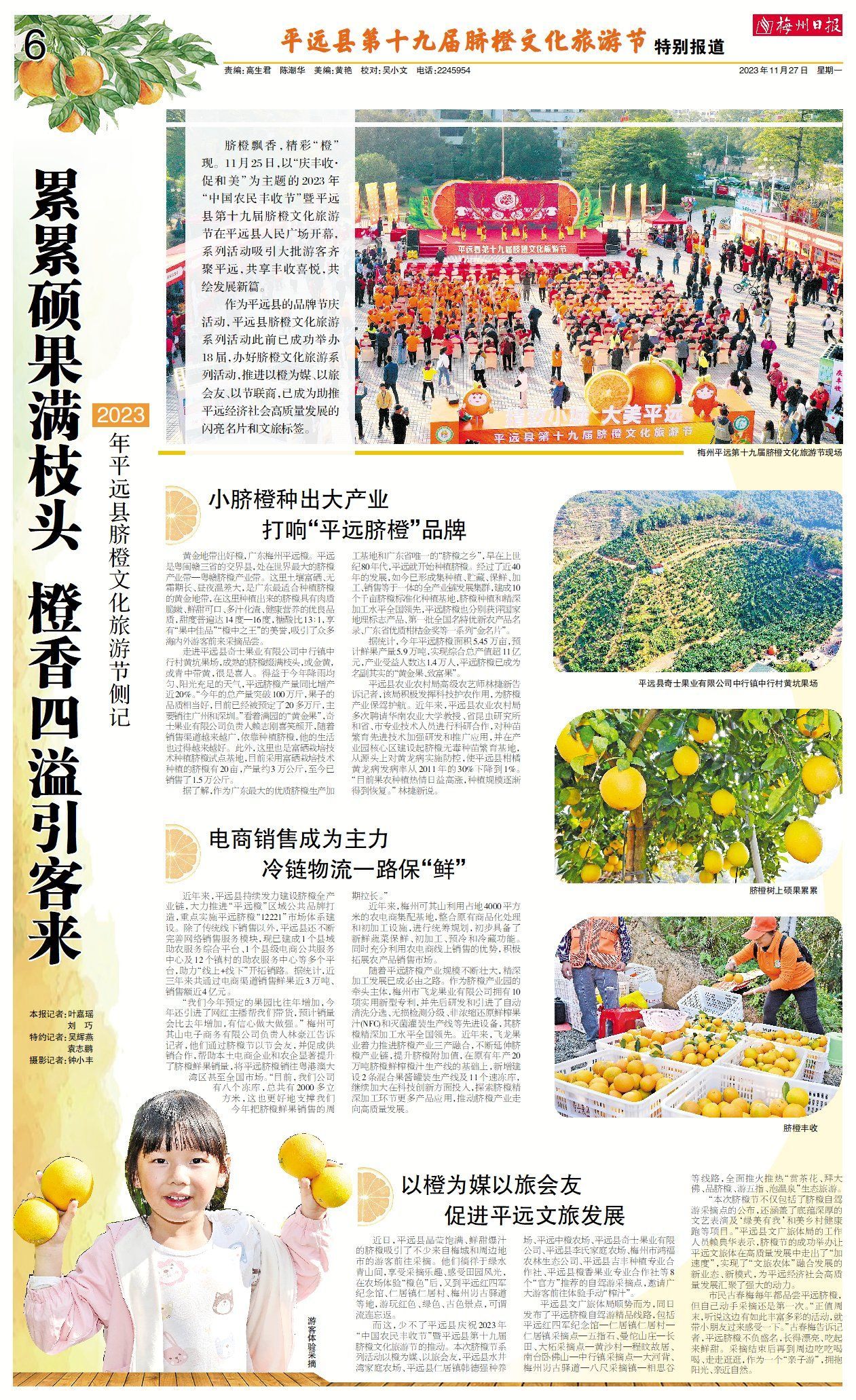 作为平远县的品牌节庆活动,平远县脐橙文化旅游系列活动此前已成功举办18届,办好脐橙文化旅游系列活动,推进以橙为媒、以旅会友、以节联商,已成为助推平远经济社会高质量发展的闪亮名片和文旅标签。