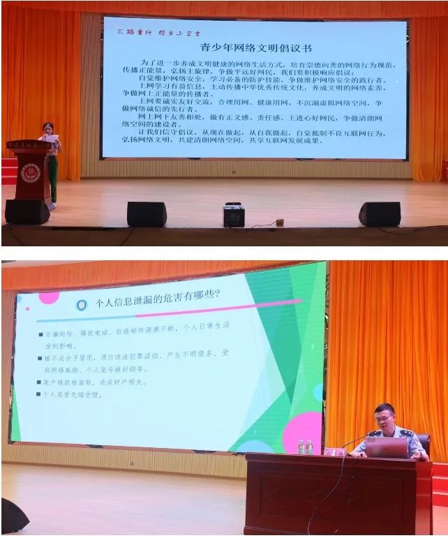 9月11日下午,城南小学举行2023年平远县网络安全宣传周暨“E路童行•橙乡小卫士”未成年人网络文明素养提升行动启动仪式,通过观看网络安全宣传周宣传片、宣读倡议书、开展网络安全专题讲座等活动形式,倡议广大青少年养成科学、健康、文明的网络生活方式,争做网络文明的宣传者和践行者。