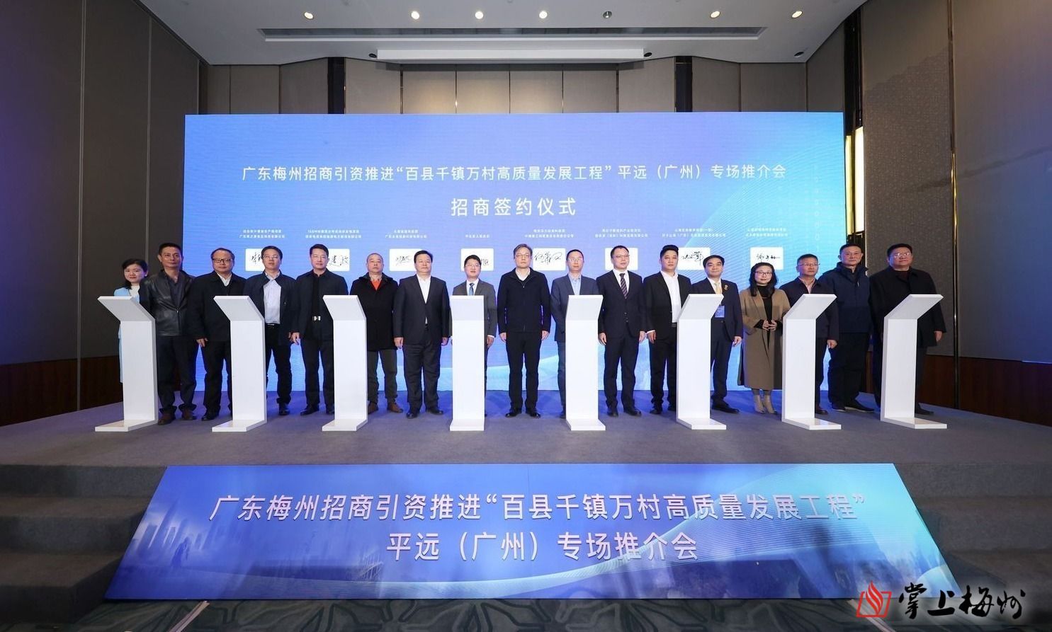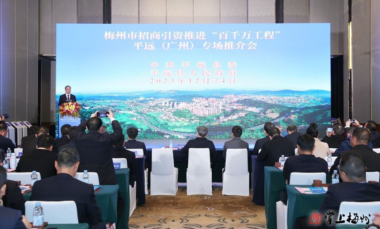 掌上梅州讯 12月24日,广东梅州招商引资推进“百千万工程”平远(广州)专场活动在广州市举行。梅州市政府副市长蒋鲲,南方财经信息中心主任朱华斌,广东省平远商会会长刘忠平,梅州市驻广州办事处主任刘采峰,梅州市驻广州招商队队长张云常,平远县委副书记、县长周小勇,以及签约项目企业代表,广东平远商会企业代表等出席活动。