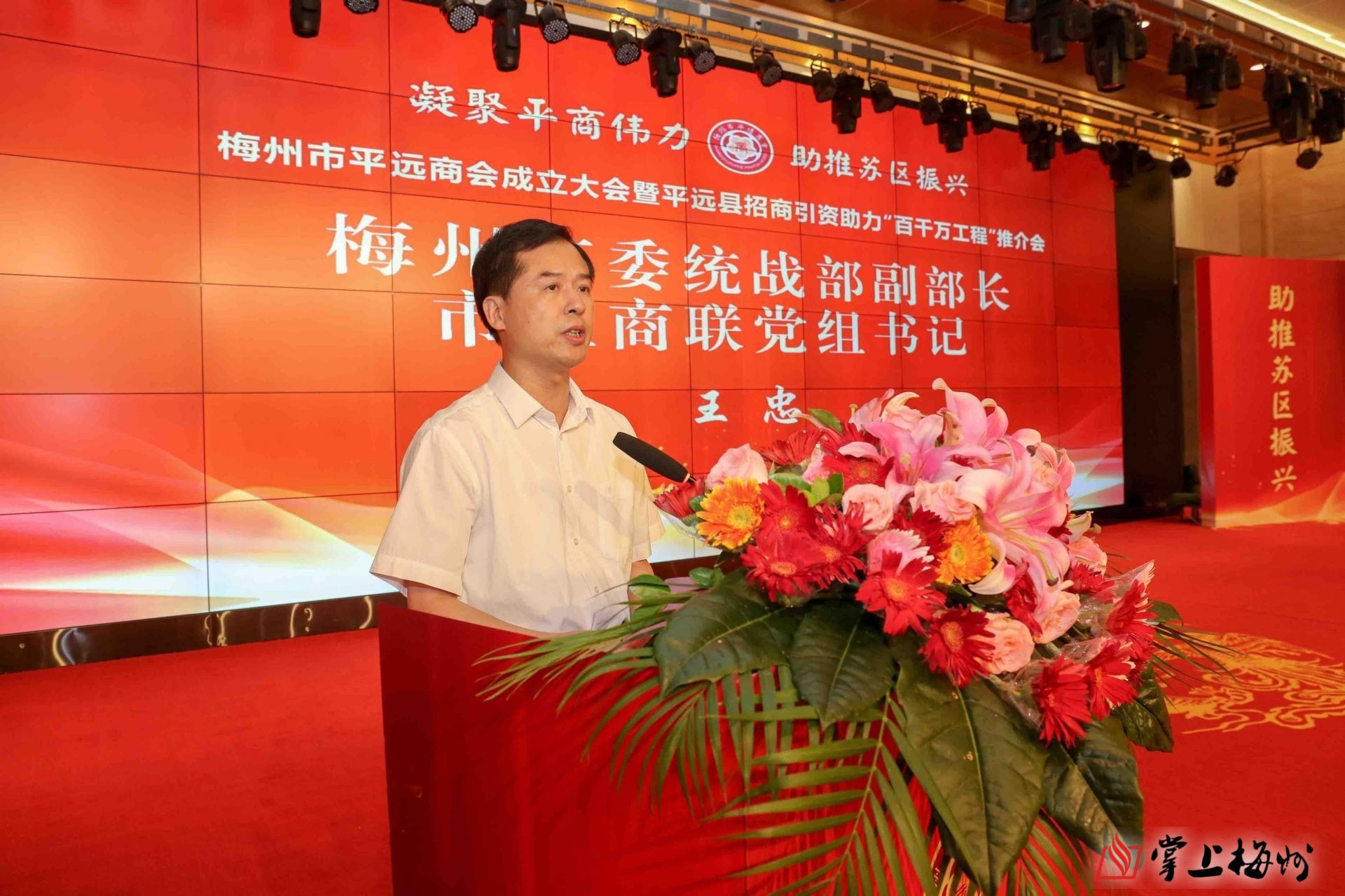 市委统战部副部长、市工商联党组书记王忠代表梅州市工商联(总商会)向梅州市平远商会成立大会暨平远县招商引资助力“百千万工程”推介会的胜利召开表示热烈祝贺。他指出,商会要始终坚持以习近平新时代中国特色社会主义思想为指导,深入贯彻落实党的二十届三中全会精神,沿着正确的政治方向努力抓好商会自身平台建设,以改革创新精神推进商会的各项工作,架好凝心聚力的“连心桥”、当好服务会员的“娘家人”、搭好联络交流的“大平台”、打造对外展示的“金招牌”,在助力“百千万工程”、乡村振兴、苏区融湾先行区建设、招商引资、绿美梅州生态建设等方面多做表率、作贡献,推动平远和梅州经济社会高质量发展。