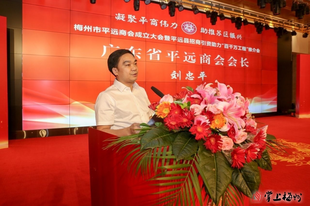 刘忠平发表了热情洋溢的致辞,他说,梅州市平远商会的成立,不仅为在梅州创业发展的平商们搭建起一个充满乡情、亲情的会员之家,也为深化梅州和平远的经济社会发展与交流架起一座更为紧密的桥梁。他希望,梅州市平远商会秉承服务、团结、尽心、尽责的主旨,团结民营企业弘扬好精神,发挥平远商会生产大智慧,联动各界人脉组织新资源,共同推动和享受梅州经济新发展和新格局。