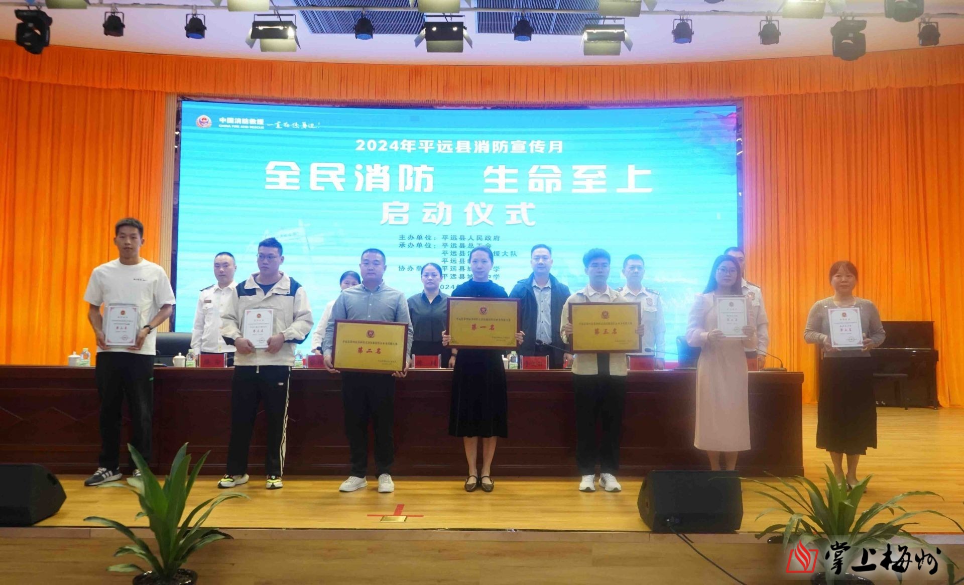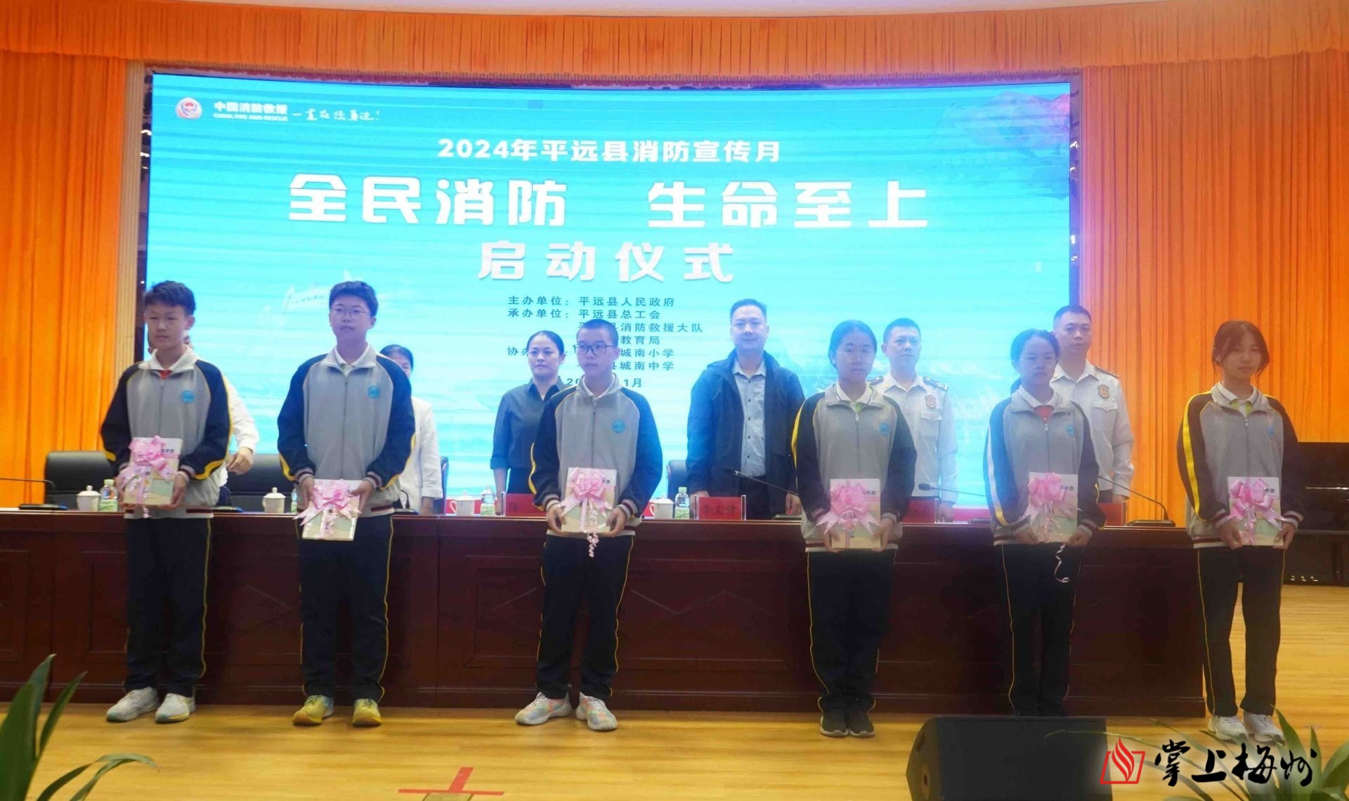 启动仪式前展示了消防文创作品展,参会人员纷纷驻足观看。仪式上部署了该县2024年“119”消防安全宣传月工作,与会领导为平远县多种形式消防救援队伍技能大赛获奖人员进行颁奖,并为全县中小学学生代表赠送消防安全教育读本和“小小消防志愿宣传员”服务队授旗,仪式结束后,同步观看了市消防宣传月启动仪式。