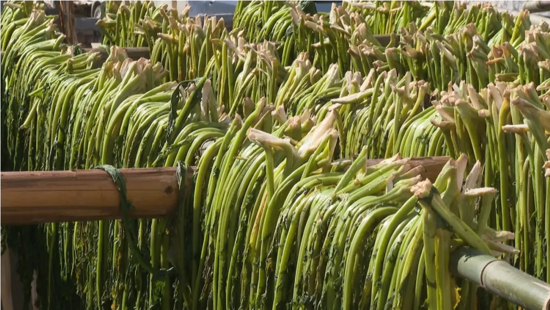 制作好的梅菜,一般要经过“割—晒—煮—晒—蒸—晒”等多道反复工序,如果天公作美,梅菜蒸一次,再晾晒七八天,嫩滑、咸香、爽口的梅菜就可以成品上市了。