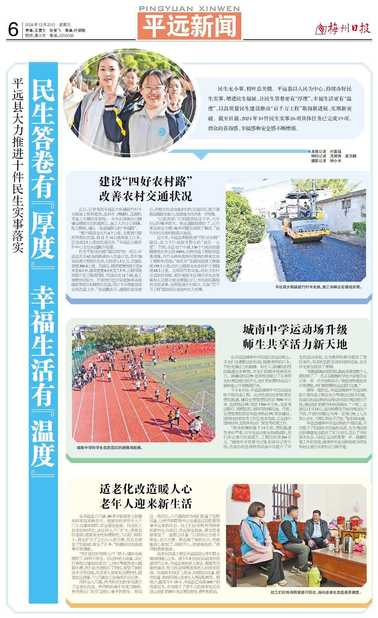 民生无小事,枝叶总关情。平远县以人民为中心,持续办好民生实事,增进民生福祉,让民生答卷更有“厚度”,幸福生活更有“温度”,以高质量民生建设推动“百千万工程”取得新进展、实现新突破。截至目前,2024年10件民生实事26项具体任务已完成19项,群众的获得感、幸福感和安全感不断增强。