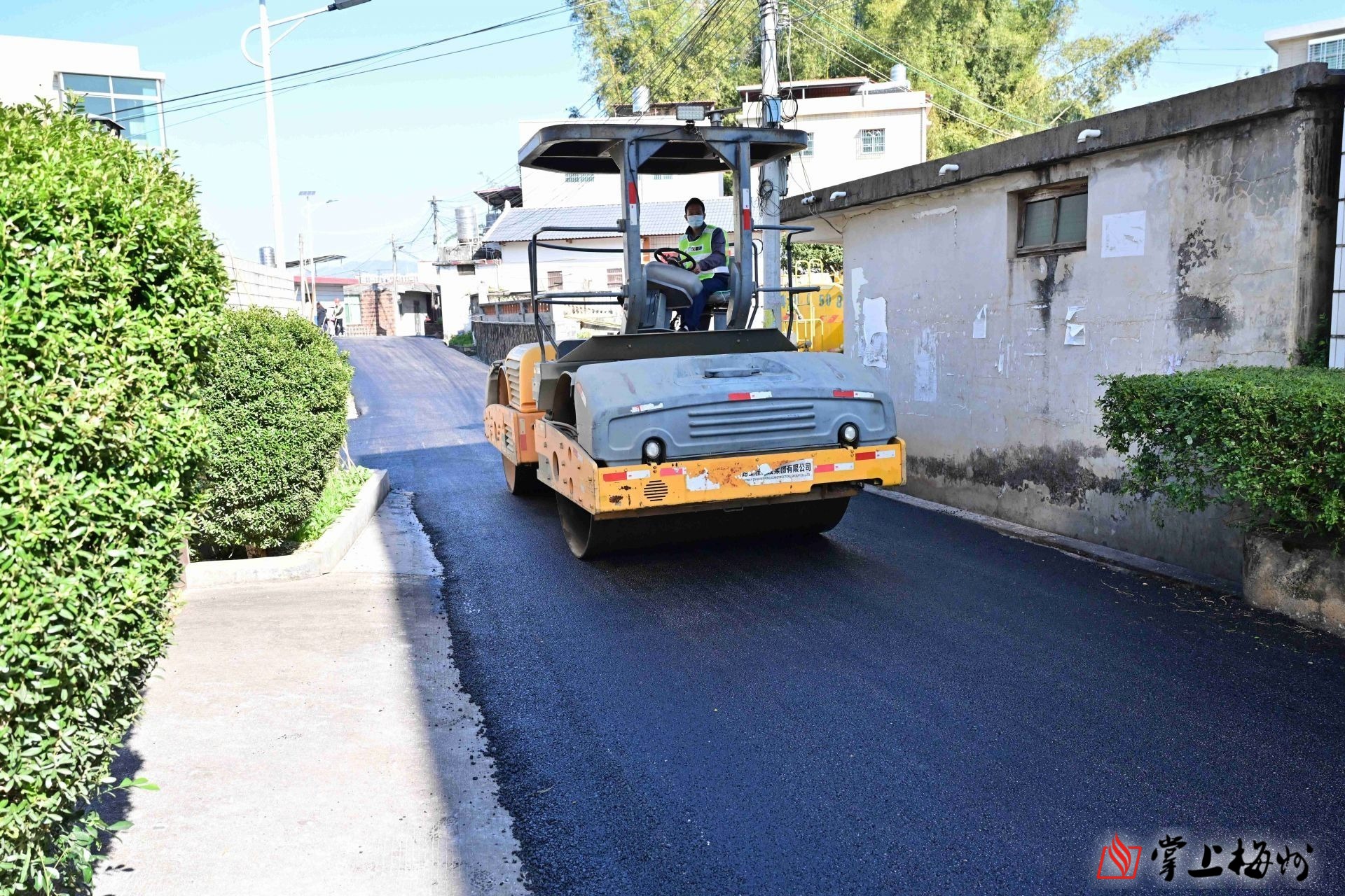 平远县大柘镇超竹村丰光路,施工车辆正在铺设沥青。