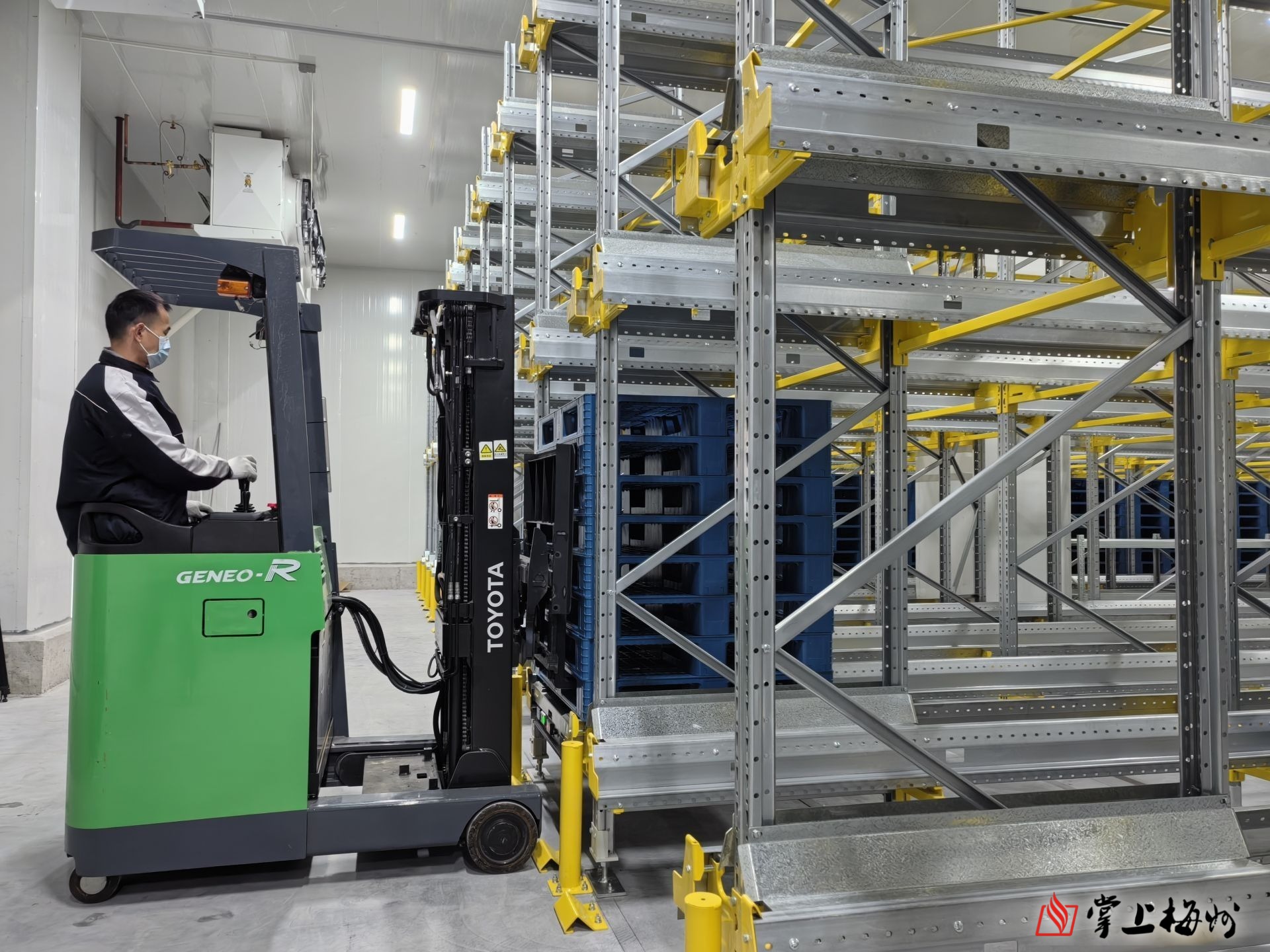 兴珠生物科技有限公司智能化冷库内,机械臂操控的小型装卸叉车灵活穿梭其间,精准高效地完成货物存取作业。 (吴辉燕 摄)