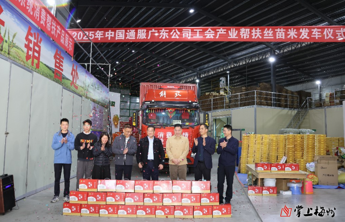 掌上梅州讯 1月8日,中国通服广东公司工会2025年产业帮扶发车仪式在丝苗米仓储基地举行,总价值约130万元的100吨平远丝苗米通过货车直达“大湾区”。