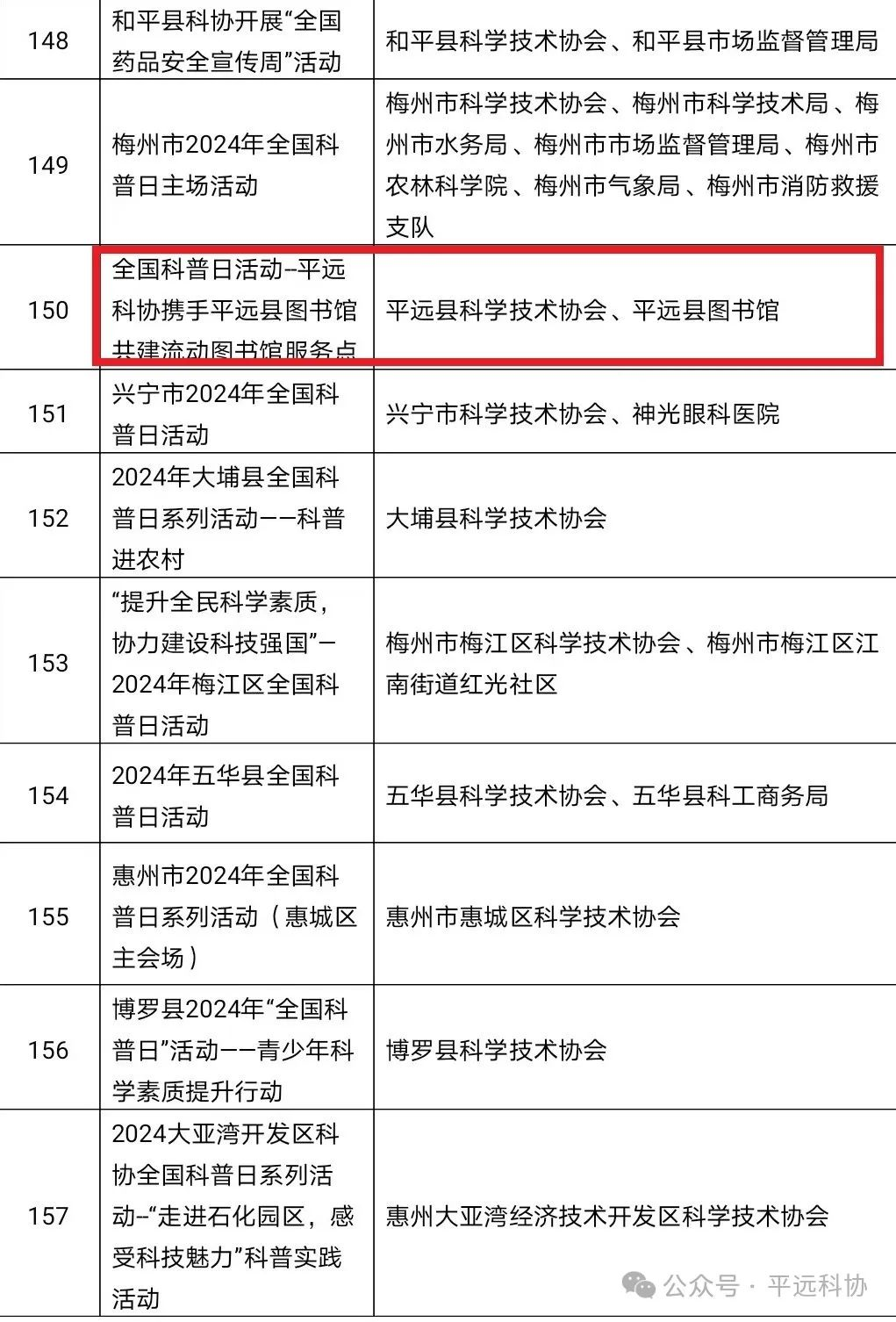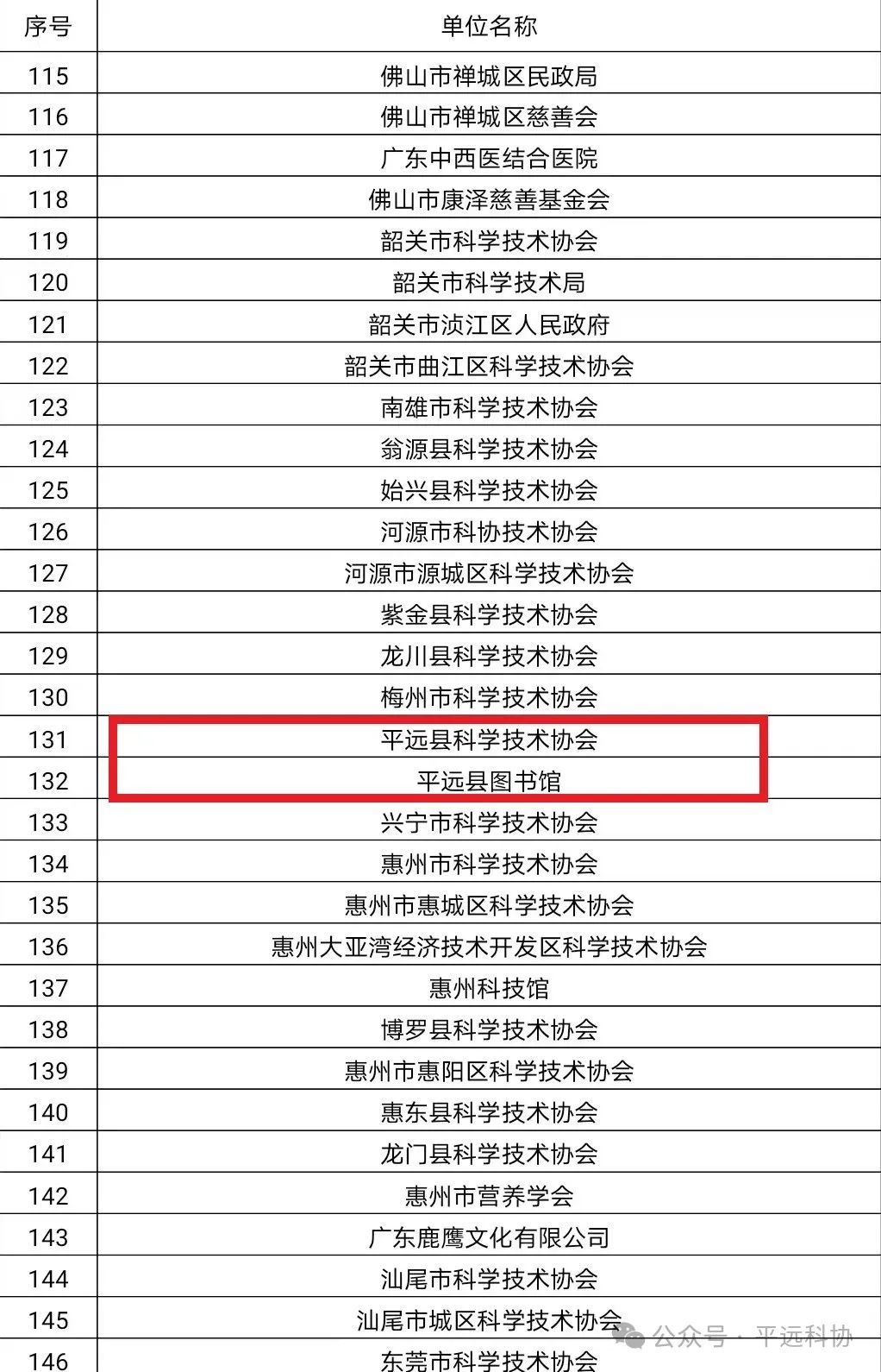 1月13日,广东省科协发出《广东省科协关于公布2024年广东省全国科普日活动优秀组织单位和优秀活动名单的通知》(粤科协普〔2025〕1号),平远县科学技术协会和平远县图书馆脱颖而出荣获优秀组织单位,相关活动荣获优秀活动称号。