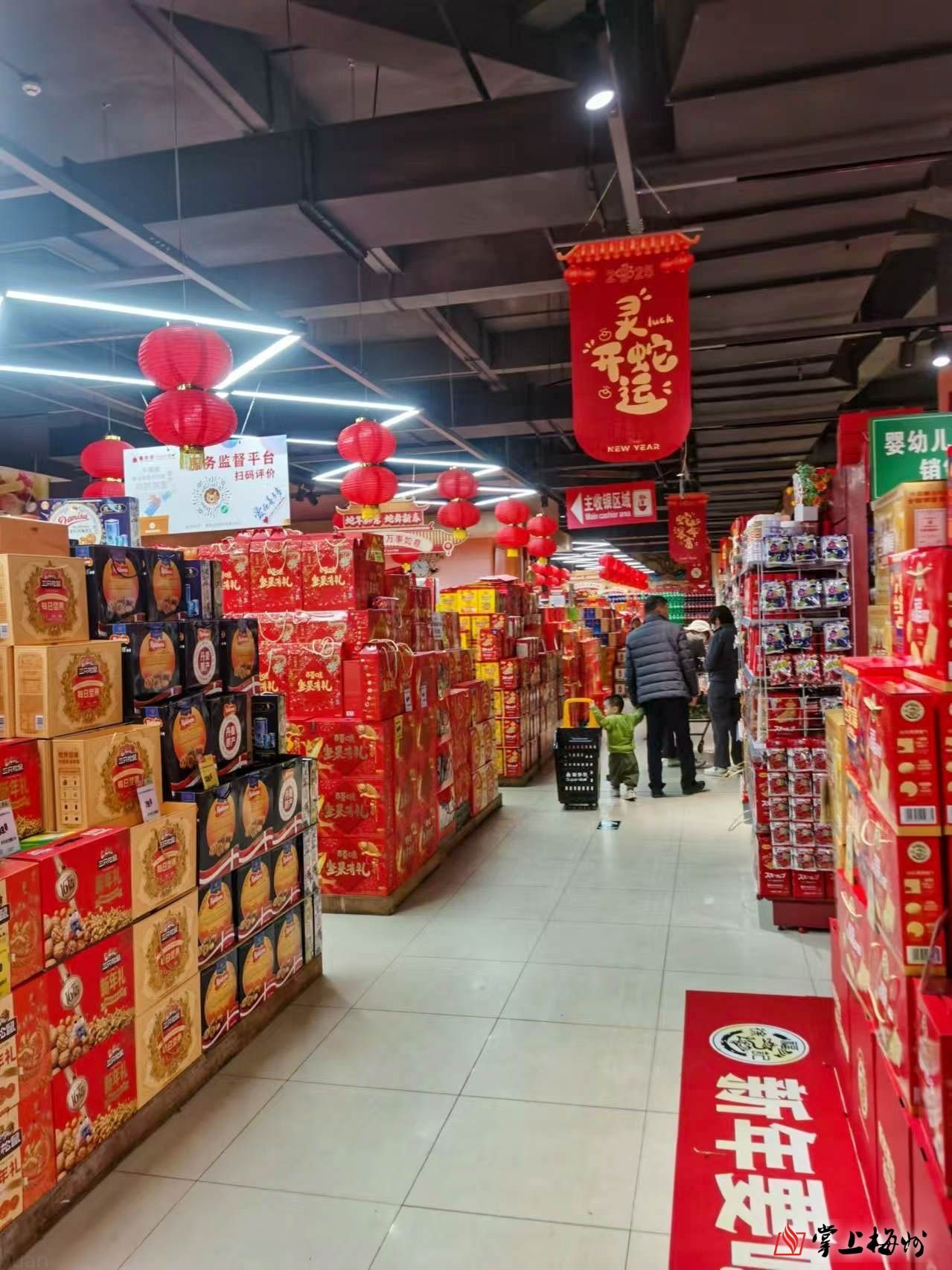 超市应节商品丰富,市民选购年货感受新春的喜庆。