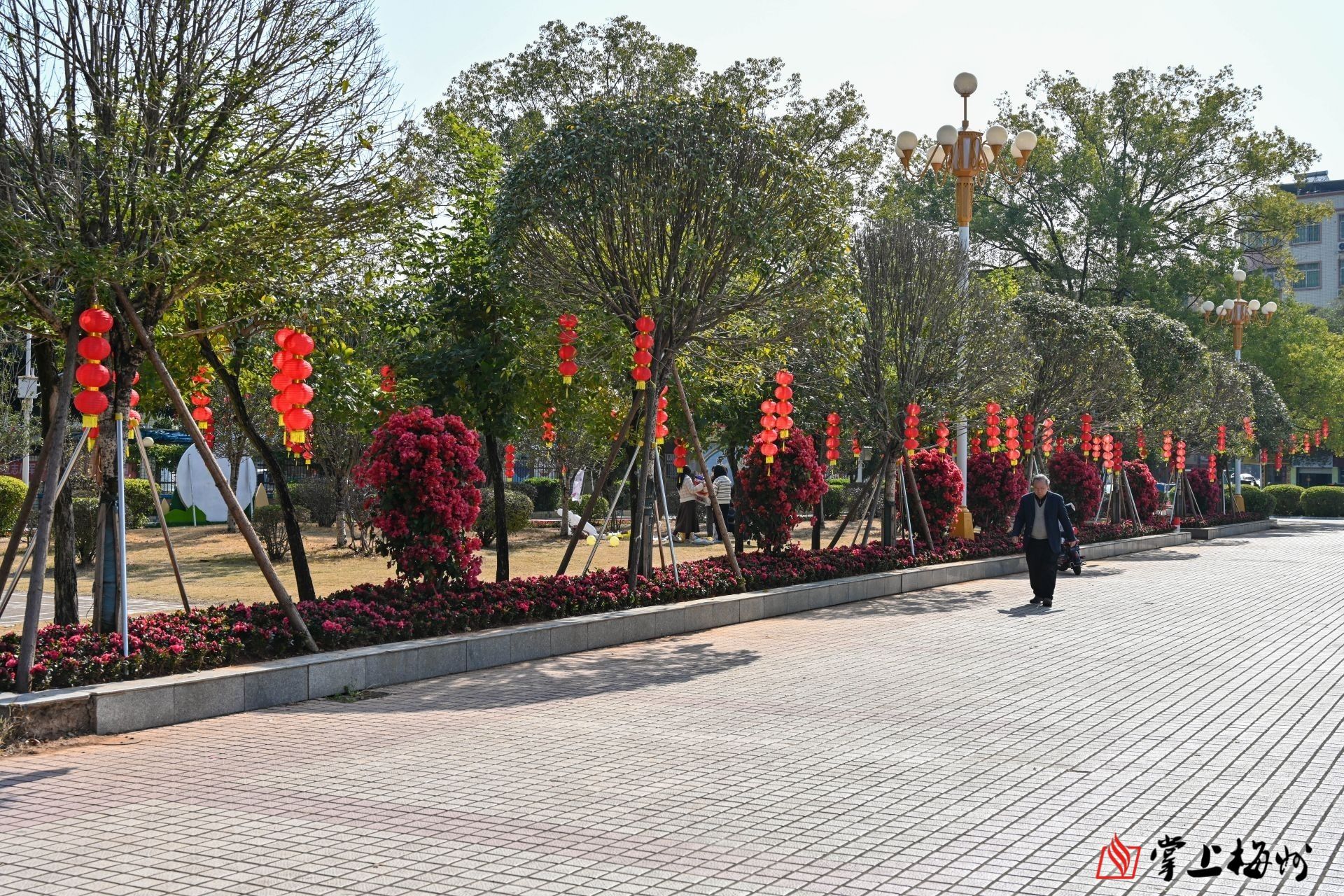 人民广场挂满红灯笼,与春花互为映衬。