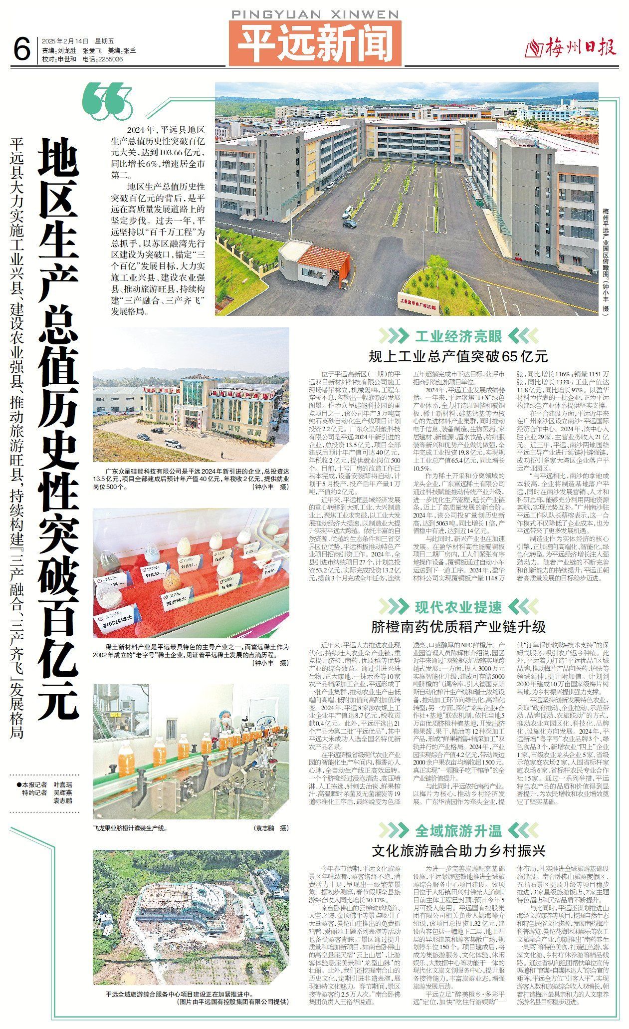 地区生产总值历史性突破百亿元的背后,是平远在高质量发展道路上的坚定步伐。过去一年,平远坚持以“百千万工程”为总抓手,以苏区融湾先行区建设为突破口,锚定“三个百亿”发展目标,大力实施工业兴县、建设农业强县、推动旅游旺县,持续构建“三产融合、三产齐飞”发展格局。