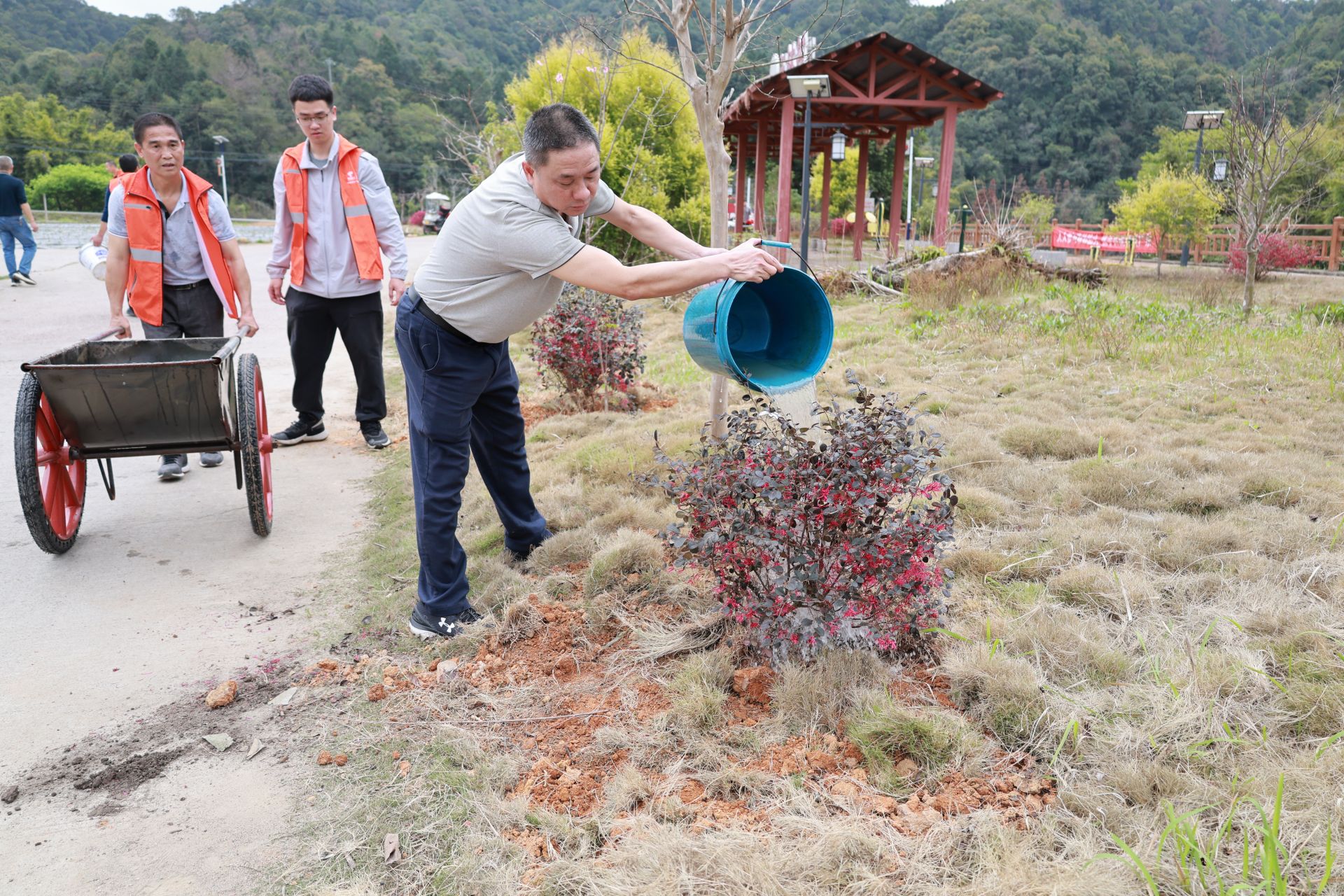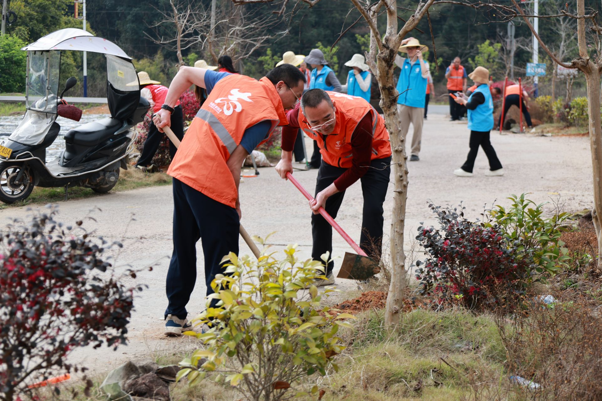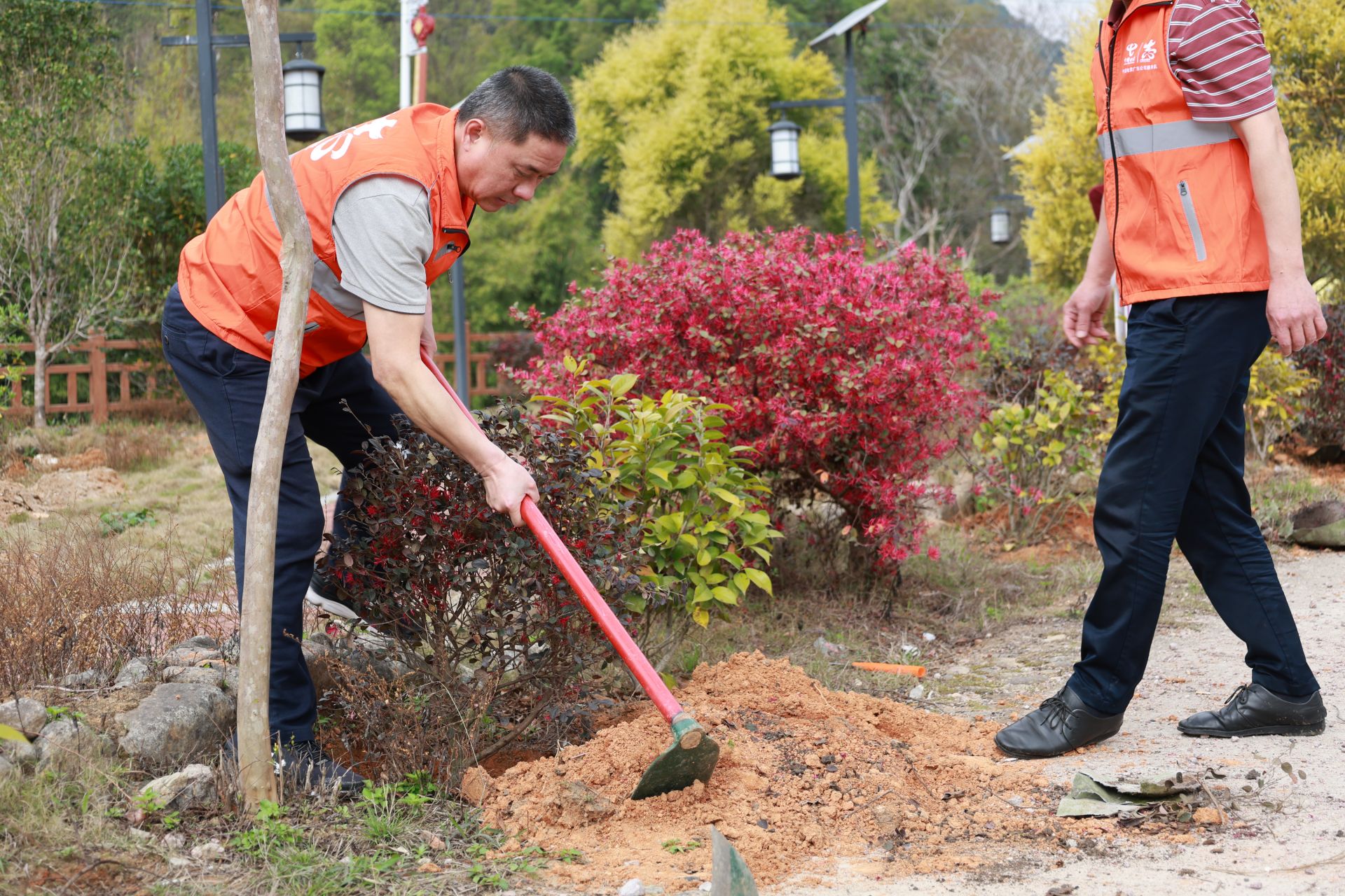 尽管天气阴霾,但志愿者们热情高涨,干劲十足。大家分工协作,挥锹铲土、扶苗填坑、培土浇水,认真细致地完成每一道工序,现场呈现出一派热火朝天的劳动景象。经过一上午的辛勤劳动,100株红花榉木在春风中昂然挺立,为初春的三达村增添了一抹新绿。