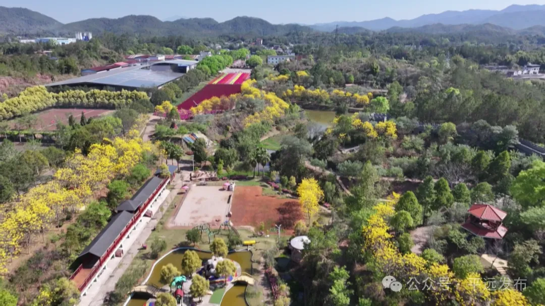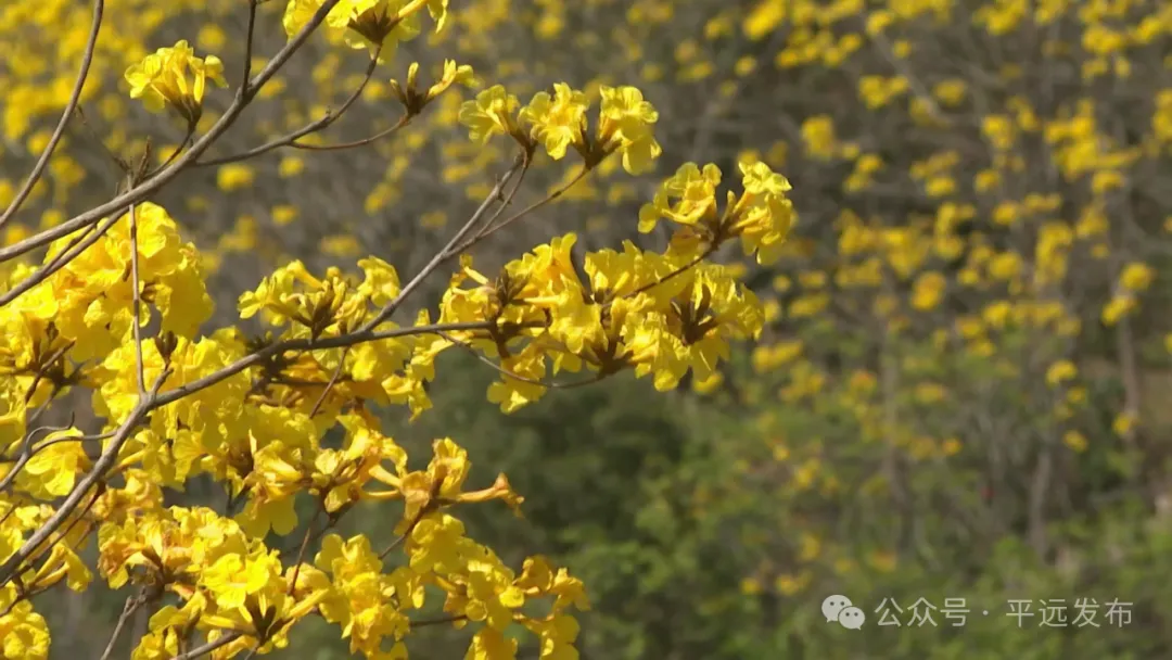 远瞻玉树泛珠黄,近见风铃洒馨香。连日来,天气晴暖,平远县长田镇曼佗山庄的黄花风铃木迎来盛花期,“金”艳绽放。金灿灿的花朵,在一众姹紫嫣红间显得格外明媚,吸引了不少市民游客赏花“打卡”。